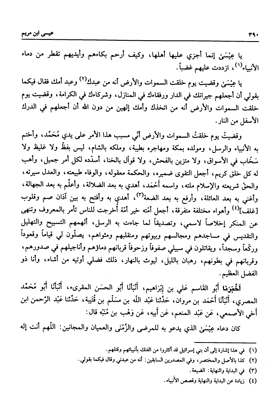 الانبياء ازددت عليهم غضبا يا عيسى وقضيت يوم خلقت السموات والارض انه من عبدك وعبد امك فقال فيكما بقولي ان اجعلهم جيرانك في الدار ورفقاءك في المنازل وشركاءك في الكرامة وقضيت يوم خلقت السموات والارض انه من اتخذك وامك الهين من دون الله ان اجعلهم في الدرك الاسفل من النار وقضيت يوم خلقت السموات والارض اني مسبب هذا الامر على يدي محمد واختم به الانبياء والرسل ومولده بمكة ومهاجرة بطيبة وملكه بالشام ليس بفظ ولا غليظ ولا سخاب في الاسواق ولا متزين بالفحش ولا قوال بالخنا اسدده لكل امر جميل واهب له كل خلق كريم اجعل التقوى ضميره والحكمة معقولة والوفاء طبيعته والعدل سيرته والحق شريعته والاسلام ملته واسمه احمد اهدي به بعد الضلة واعلم به بعد الجهالة واغني به بعد العائلة وارفع به بعد الضعة اهدي به وافتح به بين آذان صم وقلوب غلف واهواء مختلفة متفرقة اجعل امته خير امة اخرجت للناس تأمر بالمعروف وتنهى عن المنكر اخلاصا لاسمي وتصديقا لما جاءت به الرسل الهمهم التسبيح والتهليل والتقديس في مساجدهم ومجالسهم وبيوتهم ومنقلبهم ومثواهم يصلون لي قياما وقعودا وركعا وسجدا ويقاتلون في سبيلي صفوفا وزحوفا قربانهم دماؤهم واناجيلهم في صدورهم وقربانهم فيبطونهم رهبان بالليل ذلك فضلي اوتيه من اشاء وانا ذو الفضل العظيم اخبرنا أبو القاسم علي بن ابراهيم انبأنا أبو الحسن المقرئ أنبأنا أبو محمد المصري انبأنا احمد بن مروان حدثنا عبد لله بن مسلم بن قتيبة حدثنا عبد الرحمن ابن اخي الاصمعي عن عبد المنعم عن ابيه عن وهب بن منبه قال كان دعاء عيسى الذي يدعو به للمرضى والزمنى والعميان والمجانين اللهم انت اله