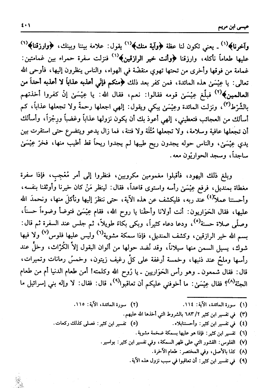 وبلغ ذلك اليهود فاقبلوا مغمومين مكروبين فنظروا الى امر معجب فإذا سفرة مغطاة بمنديل فرفع عيسى رأسه واستوى قاعدا فقال لينظر من كان خيرنا واوثقنا بنفسه واحسننا عملا عند ربه فليكشف عن هذه الآية حتى ننظر إليها ونأكل منها ونحمد الله عليها فقال الحواريون انت اولانا واحقنا يا روح الله فقام عيسى فتوضأ وضوءا حسنا وصلى صلاة حسنة ودعا دعاء كثيرا وبكى بكاء طويلا ثم جلس عند السفرة ثم قال بسم الله خير الرازقين وكشف المنديل فإذا سمكة مشوية وليس عليها فلوس ولا فيها شوك يسيل السمن منها سيلانا وقد نضد حولها من الوان البقول الا الكراث وخل عند رأسها وملح عند ذنبها وخمسة ارغفة على كل رغيف زيتون وخمس رمانات وتميرات قال فقال شمعون وهو رأس الحواريون يا روح الله وكلمته امن طعام الدنيا ام من طعام الجنة فقال عيسى ما اخوفني عليكم ان تعاقبوا قال فقال لا واله بني اسرائيل ما