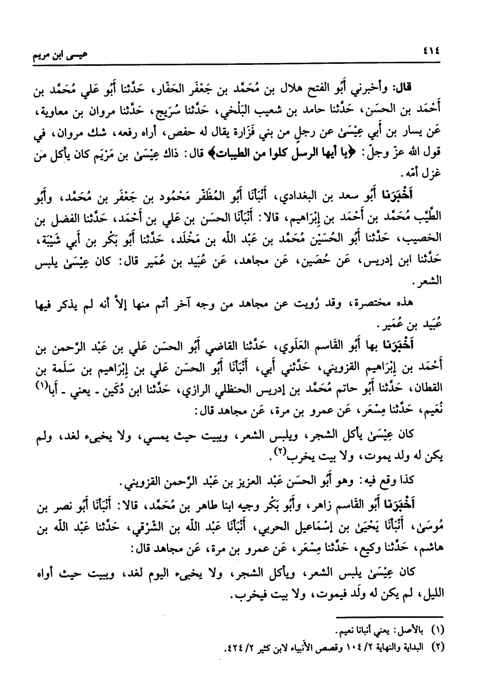 قال واخبرني أبو الفتح هلال بن محمد بن جعفر الحفار حدثنا أبو علي محمد بن احمد بن الحسن حدثنا حامد بن شعيب البلخي حدثنا سريج حدثنا مروان بن معاوية عن يسار بن ابي عيسى عن رجل من بني فزارة يقال له حفص اراه رفعه شك مروان في قول الله عز وجل " يا ايها الرسل كلوا من الطيبات " قال ذاك عيسى بن مريم كان يأكل من غزل امه اخبرنا أبو سعد بن البغدادي انبأنا أبو المظفر محمود بن جعفر بن محمد وابو الطيب محمد بن احمد بن ابراهيم قالا انبأنا الحسن بن علي بن احمد حدثنا الفضل بن الحصيب حدثنا أبو الحسين محمد بن عبد الله بن مخلد حدثنا أبو بكر بن ابي شيبة حدثنا ابن ادريس عن حصين عن مجاهد عن عبيد بن عمير قال كان عيسى يلبس الشعر هذه مختصرة وقد رويت عن مجاهد من وجه آخر اتم منها الا انه لم يذكر فيها عبيد بن عمير اخبرنا بها أبو القاسم العلوي حدثنا القاضي أبو الحسن علي بن عبد الرحمن بن احمد بن ابراهيم القزويني حدثني ابي انبأنا أبو الحسن علي بن ابراهيم بن سلمة بن القطان حدثنا أبو حاتم محمد بن ادريس الحنظلي الرازي حدثنا ابن دكين يعني ابا نعيم حدثنا مسعر عن عمرو بن مرة عن مجاهد قال كان عيسى يأكل الشجر ويلبس الشعر ويبيت حيث يمسي ولا يخبئ لغد ولم يكن له ولد يموت ولا وبيت يخرب كذا وقع فيه وهو أبو الحسن عبد العزيز بن عبد الرحمن القزويني اخبرنا أبو القاسم زاهر وابو بكر وجيه ابنا طاهر بن محمد قالا انبأنا أبو نصر بن موسى انبأنا يحيى بن اسماعيل الحربي انبأنا عبد الله بن الشرقي حدثنا عبد الله بن هاشم حدثنا وكيع حدثنا مسعر عن عمرو بن مرة عن مجاهد قال كان عيسى يلبس الشعر ويأكل الشجر ولا يخبئ اليوم لغد ويبيت حيث أواه الليل لم يكن له ولد فيموت ولا بيت فيخرب