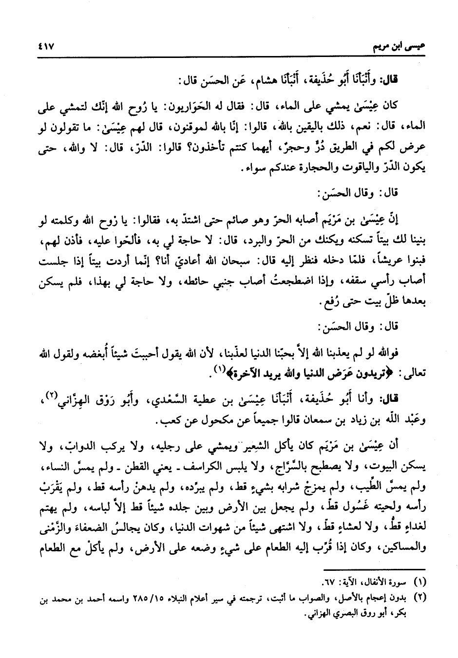 قال وانبأنا أبو حذيفة انبأنا هشام عن الحسن قال كان عيسى يمشي على الماء قال فقال الحواريون يا روح الله انك لتمشي على الماء قال نعم ذلك باليقين بالله قالوا انا بالله لموقنون قال لهم عيسى ما تقولون لو عرض لكم في الطريق در وحجر ايهما كنت تأخذون قالوا الدر قال لا والله حتى يكون الدر والياقوت والحجارة عندكم سواء قال وقال الحسن ان عيسى بن مريم اصابه الحر وهو صائم حتى اشتد به فقالوا يار روح الله وكلمته لو بنينا لك بيتا تسكنه ويكنك من الحر والبرد قال لا حاجة لي به فالحوا عليه فأذن لهم فبنوا عريشا فلما دخله فنظر إليه قال سبحان الله اعادي انا انما اردت بيتا إذا جلست اصاب رأسي سقفه وإذا اضطجعت اصاب جنبي حائطه ولا حاجة لي بهذا فلم يسكن بعدها ظل بيت حتى رفع قال وقال الحسن فوالله لو لم يعذبنا الله الا بحبنا الدنيا لعذبنا لان الله يقول احببت شيئا ابغضه ولقول الله تعالى " تريدون عرض الدنيا والله يريد الاخرة " قال وانا أبو حذيفة انبأنا عيسى بن عطية السعدي وابو روق الهزاني وعبد الله بن زياد بن سمعان قالوا جميعا عن مكحول عن كعب ان عيسى بن مريم كان يأكل الشعير ويمشي على رجليه ولا يركب الرواب ولا يسكن البيوت ولا يصطبح بالسراج ولا يلبس الكراسف يعني القطن ولم يمس النساء ولم يمس الطيب ولم يمزج شرابه بشئ قط ولم يبرده ولم يدهن رأسه قط ولم يقرب رأسه ولحيته غسول قط ولم يجعل بين الارض وبين جلده شيئا قط الا لباسه ولم يهتم لغداء قط ولا لعشاء قط ولا اشتهي شيئا من شهوات الدنيا وكان يجالس الضعفاء والزمنى والمساكين وكان إذا قرب إليه الطعام على شئ وضعه على الارض ولم يأكل مع الطعام