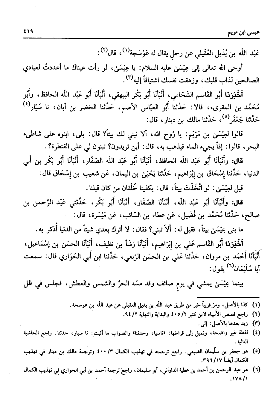عبد الله بن بديل العقيلي عن رجل يقال له عوسجة قال أوحى الله تعالى الى عيسى عليه السلام يا عيسى لو رأت عيناك ما اعددت لعبادي الصالحين لذاب قلبك وزهقت نفسك اشتياقا إليه اخبرنا أبو القاسم الشحامي انبأنا أبو بكر البيهقي انبأنا أبو عبد الله الحافظ وابو محمد بن المقرئ قالا حدثنا أبو العباس الاصم حدثنا الخضر بن ابان نا سيار حدثنا جعفر حدثنا جحفرمالك بن دينار قال قالوا لعيسى بن مريم يا روح الله الانبني لك بيتا قال بلى ابنوه على شاطئ البحر قالوا إذا يجئ الماء فيذهب به قال اين تريدون تبنون لي على القنطرة قال وانبأنا أبو عبد الله الحافظ انبأنا أبو عبد الله الصفار انبأنا أبو بكر بن ابي الدنيا حدثنا اسحاق بن ابراهيم حدثنا يحيى بن اليمان عن شعيب بن اسحاق قال قيل لعيسى لو اتخذت بيتا قال يكفينا خلقان من كان قبلنا قال وانبأنا أبو عبد الله انبأنا الصفار انبأنا أبو بكر حدثني عبد الرحمن بن صالح حدثنا محمد بن فضيل عن عطاء بن السائب عن ميسرة قال ما بنى عيسى بيتا فقيل له الا تبني فقال لا اترك بعدي شيئا من الدنيا اذكر به اخبرنا أبو القاسم علي بن ابراهيم انبأنا رشأ بن نظيف انبأنا الحسن بن اسماعيل انبأنا احمد بن مروان حدثنا علي بن الحسن الربعي حدثنا ابن ابي الحواري قال سمعت ابا سليمان يقول بينما عيسى يمشي في يوم صائف وقد مسه الحر والشمس والعطش فجلس في ظل