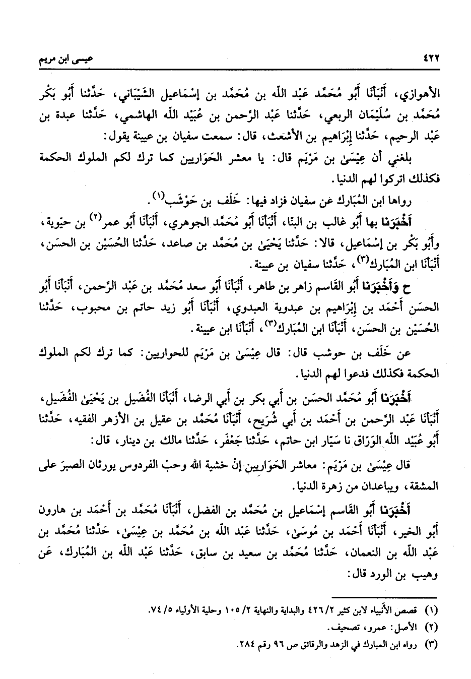 الاهوازي انبأنا أبو محمد عبد الله بن محمد بن اسماعيل الشيباني حدثنا أبو بكر محمد بن سليمان الربعي حدثنا عبد الرحمن بن عبيد الهاشمي حدثنا عبدة بن عبد الرحيم حدثنا ابراهيم بن الاشعث قال سمعت سفيان بن عيينة يقول بلغني ان عيسى بن مريم قال يا معشر الحواريين كما ترك لكم الملوك الحكمة فكذلك اتركوا لهم الدنيا رواها ابن المبارك فزاد فيها خلف بن حوشب اخبرنا بها أبو غالب بن البنا انبأنا أبو محمد الجوهري أنبأنا أبو عمر بن حيوية وابو بكر بن اسماعيل قالا حدثنا يحيى بن محمد بن صاعد حدثنا الحسين بن الحسن انبأنا ابن المبارك حدثنا سفيان بن عيينة ح وأخبرنا أبو القاسم زاهر بن طاهر أنبأنا أبو سعد محمد بن عبد الرحمن أنبأنا أبو الحسن أحمد بن إبراهيم بن عبدوية العبدي أنبأنا أبو زيد حاتم بن محبوب حدثنا الحسين بن الحسن أنبأنا ابن المبارك أنبأنا ابن عيينة عن خلف بن حوشب قال قال عيسى بن مريم للحواريين كما ترك لكم الملوك الحكمة فكذلك فدعوا لهم الدنيا اخبرنا أبو محمد الحسن بن ابي بكر بن ابي الرضا انبأنا الفضيل بن يحيى الفضيل انبأنا عبد الرحمن بن احمد بن ابي شريح انبأنا محمد بن عقيل بن الازهر الفقيه حدثنا أبو عبيد الله الوراق نا سيار ابن حاتم حدثنا جعفر حدثنا مالك بن دينار قال قال عيسى بن مريم معاشر الحواريين ان خشية الله وحب الفردوس يورثان الصبر على المشقة ويباعدان من زهرة الدنيا اخبرنا أبو القاسم اسماعيل بن محمد بن الفضل انبانا محمد بن احمد بن هارون أبو الخير انبأنا احمد بن موسى حدثنا عبد الله بن محمد بن عيسى حدثنا محمد بن عبد الله بن النعمان حدثنا محمد بن سعيد بن سابق حدثنا عبد الله بن المبارك عن وهيب بن الورد قال