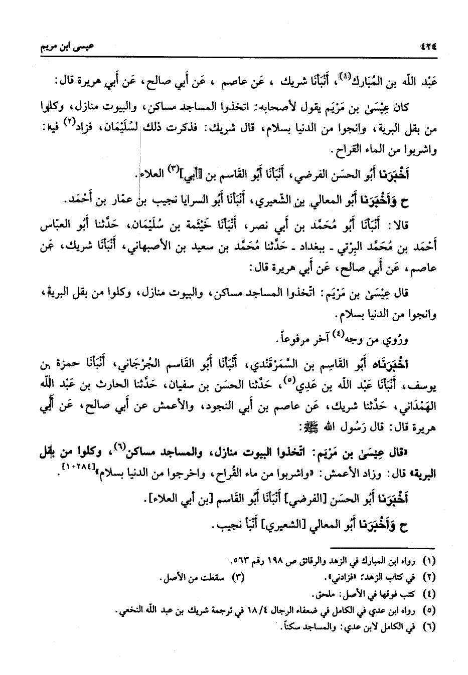 عبد الله بن المبارك انبأنا شريك عن عاصم عن ابي صالح عن ابي هريرة قال كان عيسى بن مريم يقول لاصحابه اتخذوا المساجد مساكن والبيوت منازل وكلوا من بقل البرية وانجوا من الدنيا بسلام قال شريك فذكرت ذلك لسليمان فزاد فيه واشربوا من الماء القراح اخبرنا أبو الحسن الفرضي انبأنا أبو القاسم بن ابي العلاء ح واخبرنا أبو المعالي بن الشعيري انبأنا أبو السرايا نجيب بن عمار بن احمد قالا انبأنا أبو محمد بن ابي نصر انبأنا خيثمة بن سليمان حدثنا أبو العباس احمد بن محمد البرتي ببغداد حدثنا محمد بن سعيد بن الاصبهاني انبأنا شريك عن عاصم عن ابي صالح عن ابي هريرة قال قال عيسى بن مريم اتخذوا المساجد مساكن والبيوت منازل وكلوا من بقل البرية وانجوا من الدنيا بسلام وروي من وجه آخر مرفوعا اخبرناه أبو القاسم بن السمرقندي انبأنا أبو القاسم الجرجاني انبأنا حمزة بن يوسف انبأنا عبد الله بن عدي حدثنا الحسن بن سفيان حدثنا الحارث بن عبد الله الهمداني حدثنا شريك عن عاصم بن ابي النجود والاعمش عن ابي صالح عن ابي هريرة قال قال رسول الله (صلى الله عليه وسلم) قال عيسى بن مريم اتخذوا البيوت منازل والمساجد مساكن وكلوا من بقل البرية وزاد الاعمش واشربو من ماء القراح واخرجوا من الدنيا بسلام اخبرنا أبو الحسن الفرضي انبأنا أبو القاسم بن ابي العلاء ح واخبرنا أبو المعالي الشعيري انبأ نجيب