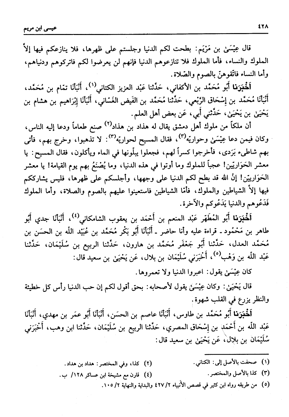 قال عيسى بن مريم بطحت لكم الدنيا وجلستم على طهرها فلا ينازعكم فيها الا الملوك والنساء فاما الملوك فلا تنازعوهم الدنيا فانهم لن يعرضوا لكم فاتركوهم وديناهم واما النساء فاتقوهن الصوم والصلاة اخبرنا أبو محمد بن الاكفاني حدثنا عبد العزيز الكتاني انبأنا تمام بن محمد انبأنا محمد بن اسحاق الربعي حدثنا محمد بن الفيض الغساني انبأنا ابراهيم بن هشام بن يحيى بن يحيى حدثني ابي عن بعض اهل العلم ان ملكا من ملوك دمشق يقال له هذاد بن هذاد صنع طعاما ودعا إليه الناس وكان فيمن دعا عيسى وحواريه فقال المسيح لحواريه لا تذهبوا وخرج بهم فاتى بهم شاطئ بردى فاخرجوا كسرا لهم فجعلوا بيلونها في الماء ويأكلون فقال المسيح يا معشر الحواريين عجبا للملوك وما اوتوا في هذه الدنيا وما سصنع بهم يوم القيامة يا معشر الحواريين ان الله قد بطح لكم الدنيا على وجهها واجلسكم على ظهرها فليس يشارككم فيها الا الشياطين والملوك فاستعينوا عليهم بالصوم والصلاة واما الملوك فدعوهم والدنيا يدعوكم والاخرة اخبرنا أبو المطهر عبد المنعم بن احمد بن يعقوب الشامكاني انبأنا جدي أبو طاهر بن محمود قراءة عليه وانا حاضر انبأنا أبو بكر محمد بن عبيد الله بن الحسن بن محمد العدل حدثنا أبو جعفر محمد بن هارون حدثنا الربيع بن سليمان حدثنا عبد الله بن وهب أخبرني سليمان بن بلال عن يحيى بن سعيد قال كان عيسى يقول اعبروا الدنيا ولا تعمروها قال يحيى وكان عيسى يقول لاصحابه بحق اقول لكم ان حب الدنيا رأس كل خطيئة والنظر يزرع في القلب شهوة اخبرنا أبو محمد بن طاوس انبأنا عاصم بن الحسن انبأنا أبو عمر بن مهدي انبأنا عبد الله بن احمد بن اسحاق المصري حدثنا الربيع بن سليمان حدثنا ابن وهب اخبرني سليمان بن بلال عن يحيى بن سعيد قال