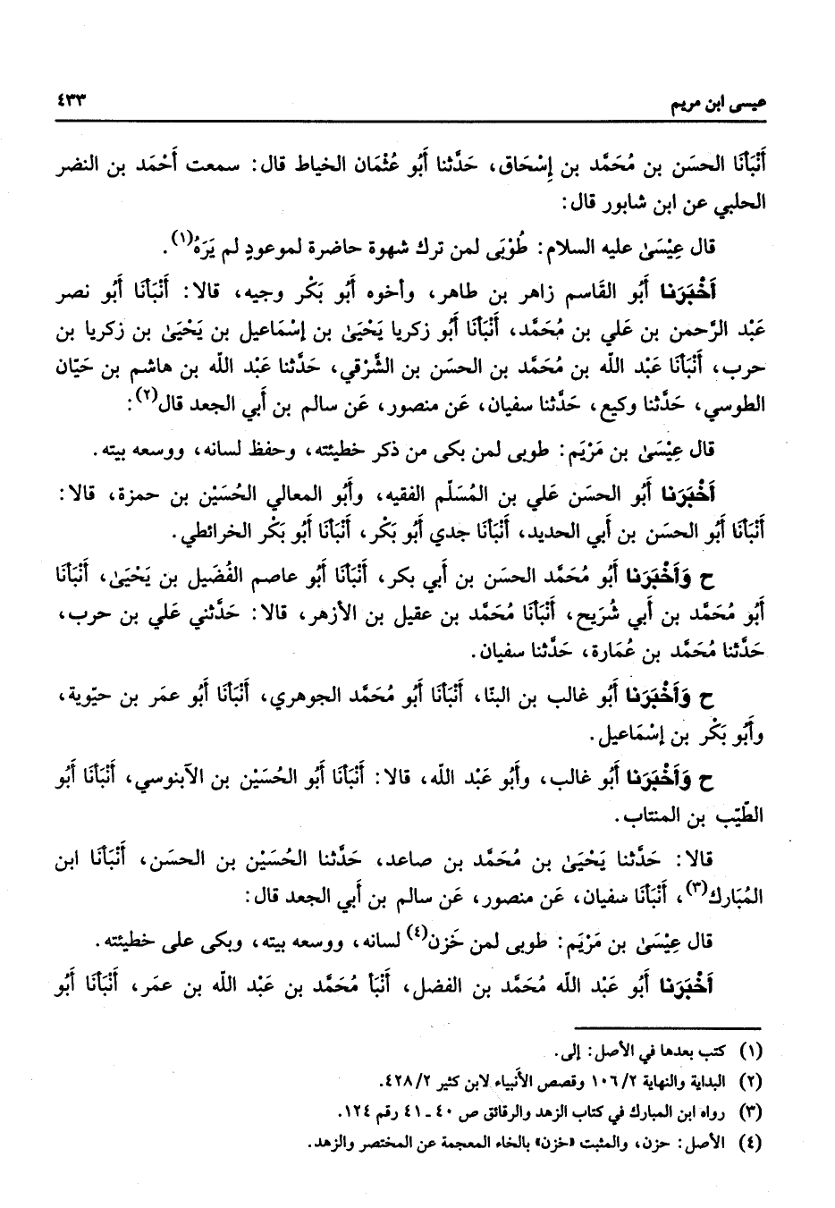 أنبأنا الحسن بن محمد بن إسحاق حدثنا أبو عثمان الخياط قال سمعت احمد بن النضر الحلبي عن ابن شابور قال قال عيسى عليه السلام طوبى لمن ترك شهوة حاضرة لموعود لم يره أخبرنا أبو القاسم زاهر بن طاهر وأخوه أبو بكر وجيه قالا أنبأنا أبو نصر عبد الرحمن بن علي بن محمد أنبأنا أبو زكريا يحيى بن إسماعيل بن يحيى بن زكريا بن حرب أنبأنا عبد الله بن محمد بن الحسن بن الشرقي حدثنا عبد الله بن هاشم بن حيان الطوسي حدثنا وكيع حدثنا سفيان عن منصور عن سالم بن أبي الجعد قال قال عيسى بن مريم طوبى لمن بكى من ذكر خطيئته وحفظ لسانه ووسعه بيته أخبرنا أبو الحسن علي بن المسلم الفقيه وأبو المعالي الحسين بن حمزة قالا أنبأنا أبو الحسن بن أبي الحديد أنبأنا جدي أبو بكر أنبأنا أبو بكر الخرائطي ح وأخبرنا أبو محمد الحسن بن ابي بكر أنبأنا أبو عاصم الفضيل بن يحيى أنبأنا أبو محمد بن أبي شريح أنبأنا محمد بن عقيل بن الأزهر قالا حدثني علي بن حرب حدثنا محمد بن عمارة حدثنا سفيان ح وأخبرنا أبو غالب بن البنا أنبأنا أبو محمد الجوهري أنبأنا أبو عمر بن حيوية وأبو بكر بن إسماعيل ح وأخبرنا أبو غالب وأبو عبد الله قالا أنبأنا أبو الحسين بن الآبنوسي أنبأنا أبو الطيب بن المنتاب قالا حدثنا يحيى بن محمد بن صاعد حدثنا الحسين بن الحسن أنبأنا ابن المبارك أنبأنا سفيان عن منصور عن سالم بن ابي الجعد قال قال عيسى بن مريم طوبى لمن خزن لسانه ووسعه بيته وبكى على خطيئته أخبرنا أبو عبد الله محمد بن الفضل أنبأ محمد بن عبد الله بن عمر أنبأنا أبو