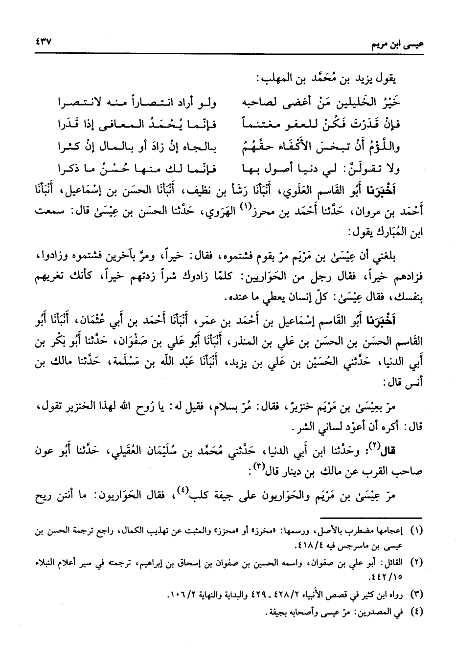 3 - رواه ابن كثير في قصص الانبياء 2 / 428 - 429 والبداية والنهاية 2 / 106 4 - في المصدرين: مر عيسى وأصحابه بجيفة