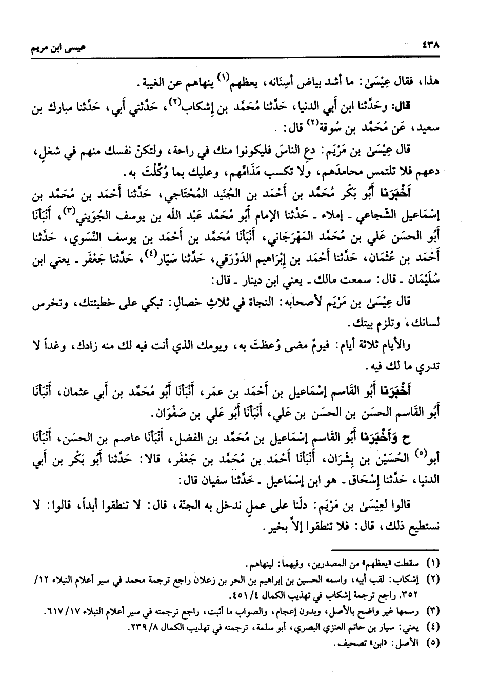 هذا فقال عيسى ما اشد بياض اسنانه يعظهم ينهاهم عن الغيبة قال وحدثنا ابن ابي الدنيا حدثنا محمد بن اشكاب حدثني ابي حدثنا مبارك بن سعيد عن محمد بن سوقة قال قال عيسى بن مريم دع الناس فليكونوا منك في راحة ولتكن نفسك منهم في شغل دعهم فلا تلتمس محامدهم ولا تكسب مذامهم وعليك بما وكلت به اخبرنا أبو بكر محمد بن احمد بن الجنيد المحتاجي حدثنا احمد بن محمد بن اسماعيل الشجاعي املاء حدثنا الامام أبو محمد عبد الله بن يوسف الجويني انبأنا أبو الحسن علي بن محمد المهرجاني انبأنا محمد بن احمد بن يوسف النسوي حدثنا احمد بن عثمان حدثنا احمد بن ابراهيم الدورقي حدثنا سيار حدثنا جعفر يعني ابن سليمان قال سمعت مالك يعني ابن دينار قال قال عيسى بن مريم لأصحابه النجاة في ثلاث خصال تبكي على خطيئتك وتخرس لسانك وتلزم بيتك والايام ثلاثة ايام فيوم مضى وعظت به ويومك الذي انت فيه لك منه زادك وغدا لا تدري ما لك فيه اخبرنا أبو القاسم اسماعيل بن احمد بن عمر انبانا أبو محمد بن ابي عثمان انبأنا أبو القاسم الحسن بن الحسن بن علي انبأنا أبو علي بن صفوان ح واخبرنا أبو القاسم اسماعيل بن محمد بن الفضل انبأنا عاصم بن الحسن انبأنا أبو الحسين بن بشران انبأنا احمد بن محمد بن جعفر قالا حدثنا أبو بكر بن ابي الدنيا حدثنا اسحاق هو ابن اسماعيل حدثنا سفيان قال قالوا لعيسى بن مريم دلنا على عمل ندخل به الجنة قال لا تنطقوا ابدا قالوا لا نستطيع ذلك قال فلا تنطقوا إلا بخير