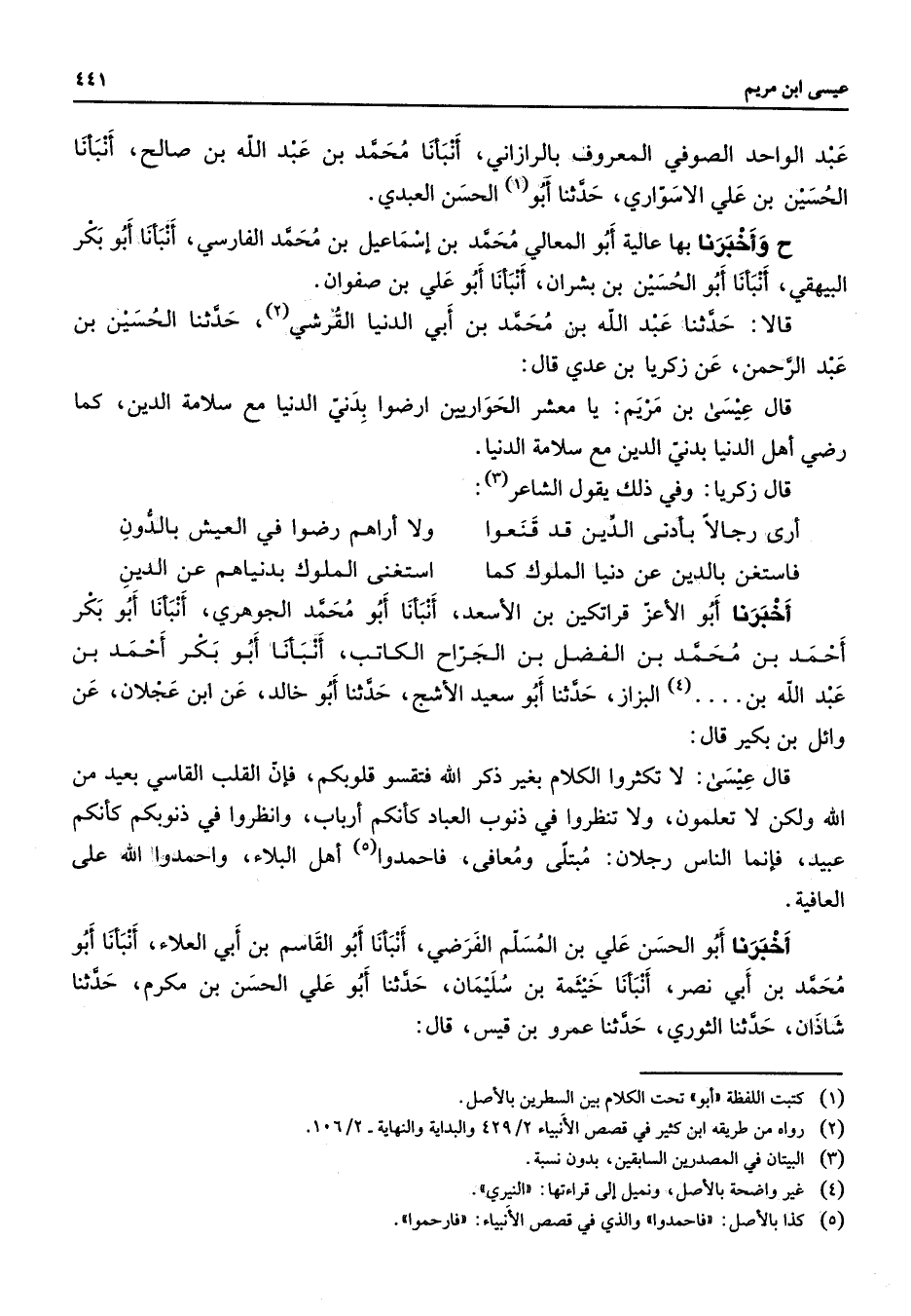 عبد الواحد الصوفي المعروف بالرازاني انبأنا محمد بن عبد الله بن صالح انبأنا الحسين بن علي الاسواري حدثنا أبو الحسن العبدي ح واخبرنا بها عالية أبو المعالي محمد بن اسماعيل بن محمد الفارسي انبأنا أبو بكر البيهقي انبأنا أبو الحسين بن بشران انبأنا أبو علي بن صفوان قالا حدثنا عبد الله بن محمد بن ابي الدنيا القرشي حدثنا الحسين بن عبد الرحمن عن زكريا بن عدي قال قال عيسى بن مريم يا معشر الحواريين ارضوا بدني الدنيا مع سلامة الدين كما رضي اهل الدنيا بدني الدين مع سلامة الدنيا وقال زكريا وفي ذلك يقول الشاعر ارى رجالا بأدنى الدين قد قنعوا * ولا اراهم رضوا في العيش بالدون فاستغن بالدين عن دنيا الملوك كما * استغنى الملوك بدنياهم عن الدين * اخبرنا أبو الاعز قراتكين بن الاسعد انبأنا أبو محمد الجوهري انبأنا أبو بكر أحمد بن محمد بن الفضل بن الجراح الكاتب أنبأنا أبو بكر احمد بن عبد الله بن البزاز حدثنا أبو سعيد الاشج حدثنا أبو خالد عن ابن عجلان عن وائل بن بكير قال قال عيسى لا تكثروا الكلام بغير ذكر الله فتقسوا قلوبكم فان القلب القاسي بعيد من الله ولكن لا تعلمون ولا تنظرو في ذنوب العباد كأنكم ارباب وانظروا في ذنوبكم كأنكم عبيد فانما الناس رجلان مبتلى ومعافى فاحمدوا اهل البلاء واحمدوا الله على العافية اخبرنا أبو الحسن علي بن المسلم الفرضي انبأنا أبو القاسم بن ابي العلاء انبأنا أبو محمد بن ابي نصر انبأنا خيثمة بن سليمان حدثنا أبو علي الحسن بن مكرم حدثنا شاذان حدثنا الثوري حدثنا عمرو بن قيس قال