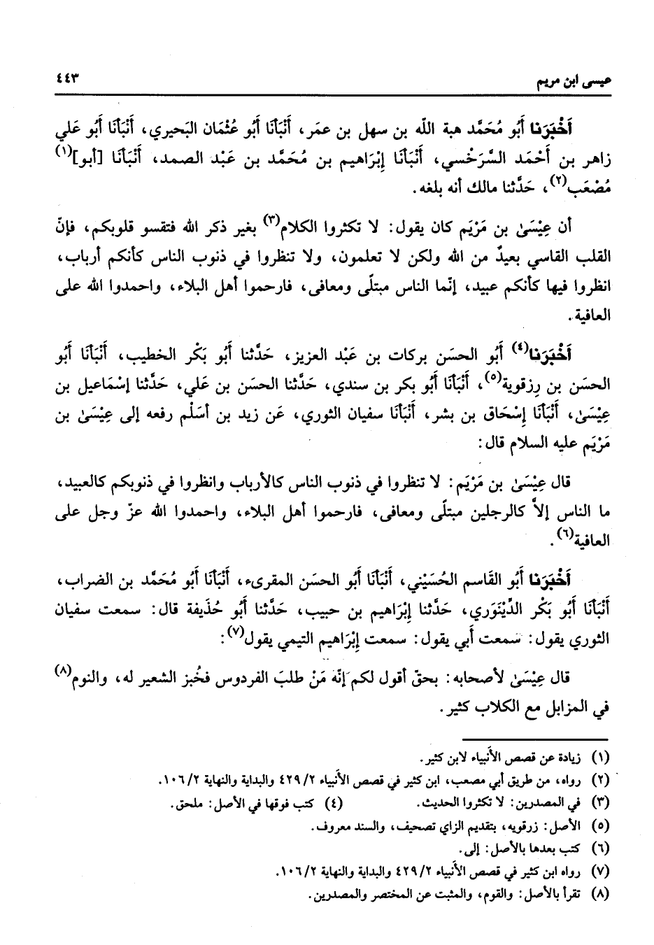 اخبرنا أبو محمد هبة الله بن سهل بن عمر انبأنا أبو عثمان البحيري انبأنا أبو علي زاهر بن احمد السرخسي انبأنا ابراهيم بن محمد بن عبد الصمد انبأنا أبو مصعب حدثنا مالك انه بلغه ان عيسى بن مريم كان يقول لا تكثروا الكلام بغير ذكر الله فتقسو قلوبكم فان القلب القاسي بعيد من الله ولكن لا تعلمون ولا تنظروا في ذنوب الناس كأنكم ارباب انظروا فيها كأنكم عبيد انما الناس مبتلى ومعافى فارحموا اهل البلاء واحمدوا الله على العافية اخبرنا أبو الحسن بركات بن عبد العزيز حدثنا أبو بكر الخطيب انبأنا أبو الحسن بن رزقوية انبأنا أبو بكر بن سندي حدثنا الحسن بن علي حدثنا اسماعيل بن عيسى انبأنا اسحاق بن بشر انبأنا سفيان الثوري عن زيد بن اسلم رفعه الى عيسى بن مريم عليه السلام قال قال عيسى بن مريم لا تنظروا في ذنوب الناس كالارباب وانظروا في ذنوبكم كالعبيد ما الناس الا كالرجلين مبتلى ومعافى فارحموا اهل البلاء واحمدوا الله عزوجل على العافية اخبرنا أبو القاسم الحسيني انبأنا أبو الحسن المقرئ انبأنا أبو محمد بن الضراب انبأنا أبو بكر الدينوري حدثنا ابراهيم بن حبيب حدثنا أبو حذيفة قال سمعت سفيان الثوري يقول سمعت ابي يقول سمعت ابراهيم التيمي يقول قال عيسى لاصحابه بحق اقول لكم انه من طلب الفردوس فخبز الشعير له والنوم في المزابل مع الكلاب كثير