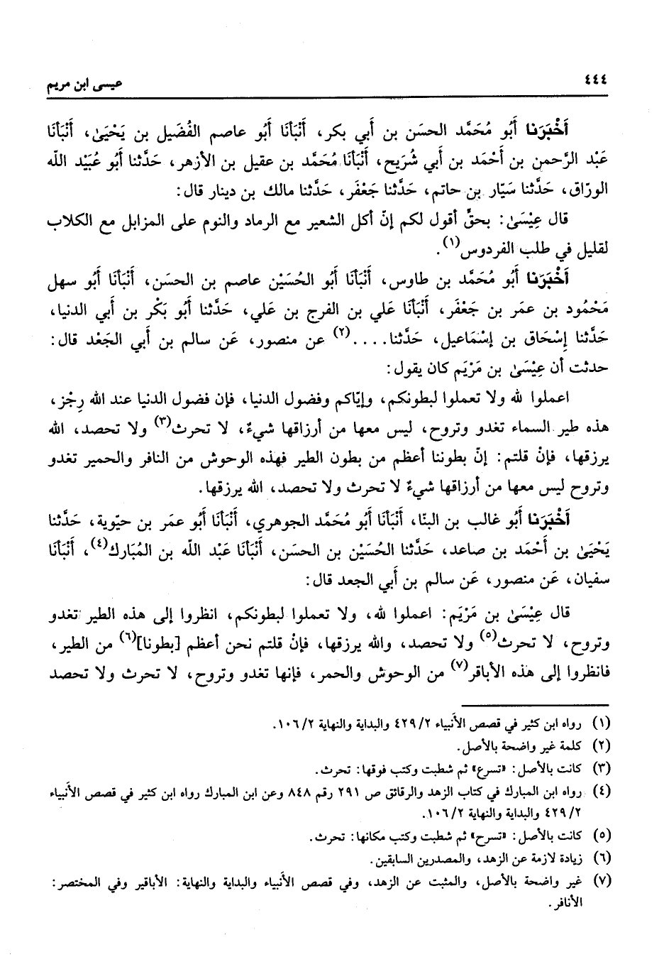 اخبرنا أبو محمد الحسن بن ابي بكر انبأنا أبو عاصم الفضيل بن يحيى انبأنا عبد الرحمن بن احمد بن ابي شريح انبأنا محمد بن عقيل بن الازهر حدثنا أبو عبيد الله الوراق حدثنا سيار بن حاتم حدثنا جعفر حدثنا مالك بن دينار قال قال عيسى بحق اقول لكم ان اكل الشعير مع الرماد والنوم على المزابل مع الكلاب لقليل في طلب الفردوس اخبرنا أبو محمد بن طاوس انبأنا أبو الحسين عاصم بن الحسن انبأنا أبو سهل محمود بن عمر بن جعفر انبأنا علي بن الفرج بن علي حدثنا أبو بكر بن ابي الدنيا حدثنا إسحاق بن اسماعيل حدثنا 0000 عن منصور عن سالم بن ابي الجعد قال حدثت ان عيسى بن مريم كان يقول اعملوا لله ولا تعملوا لبطونكم واياكم وفضول الدنيا فان فضول الدنيا عند الله رجز هذه طير السماء تغدو وتروح ليس معها من ارزاقها شئ لا تحرث ولا تحصد الله يرزقها فان قلتم ان بطوننا اعطم من بطون الطير فهذه الوحوش من النافر والحمير تغدو وتروح ليس معها من ارزاقها شئ لا تحرث ولا تحصد الله يرزقها اخبرنا أبو غالب بن البنا انبأنا أبو محمد الجوهري انبأنا أبو عمر بن حيوية حدثنا يحيى بن احمد بن صاعد حدثنا الحسين بن الحسن انبأنا عبد الله بن المبارك انبأنا سفيان عن منصور عن سالم بن ابي الجعد قال قال عيسى بن مريم اعملوا لله ولا تعملوا لبطونكم انظروا الى هذه الطير تغدو وتروح لا تحرث ولا تحصد والله يرزقها فان قلتم نحن اعظم بطونا من الطير فانظروا الى هذه الاباقر من الوحوش فانها تغدو وتروح لا تحرث ولا تحصد