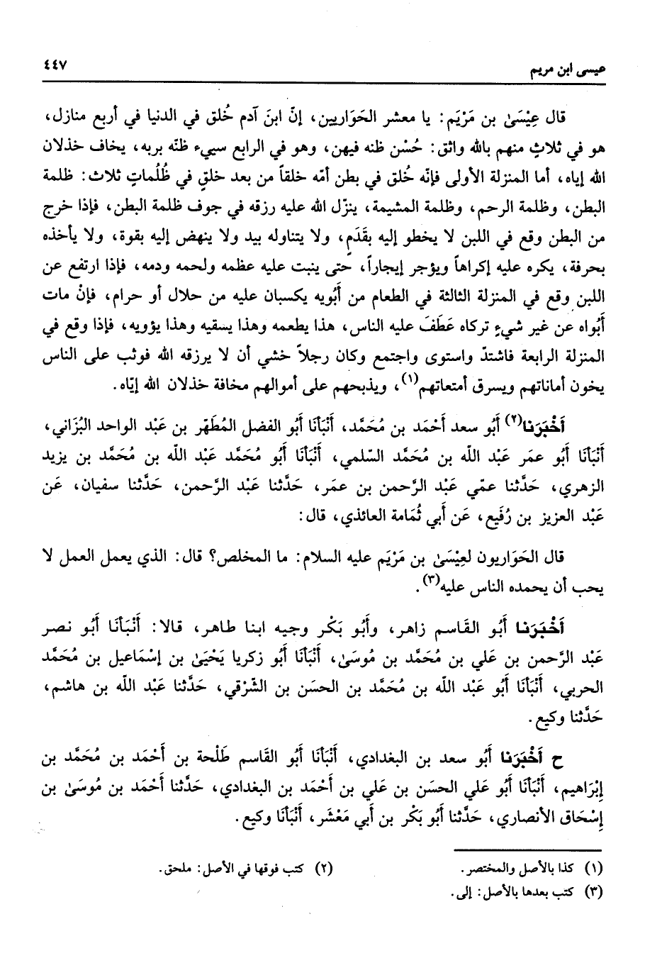 قال عيسى بن مريم يا معشر الحواريين إن ابن آدم خلق في الدنيا في أربع منازل هو في ثلاث منهم بالله واثر حسن ظنه فيهن وهو في الرابع سيئ ظنه بربه يخاف خذلان الله إياه أما المنزلة الأولى فإنه خلق في بطن أمه خلقا من بعد خلق في ظلمات ثلاث ظلمة البطن وظلمة الرحم وظلمة المشيمة ينزل الله عليه رزقه في جوف ظلمة البطن فإذا خرج من البطن وقع في اللبن لا يخطو إليه بقدم ولا يتناوله بيد ولا ينهض إليه بقوة ولا يأخذ بحرفة يكره عليه إكراها ويؤجر إيجارا حتى ينبت عليه عظمه ولحمه ودمه فإذا ارتفع عن اللبن وقع في المنزلة الثالثة في الطعام من أبويه يكسبان عليه من حلال أو حرام فإن مات أبواه من غير شئ تركاه عطف الناس عليه هذا يطعمه وهذا يسقيه وهذا يؤويه فإذا وقع في المنزلة الرابعة فاشتد واستوى واجتمع وكان رجلا خشي أن لا يرزقه الله فوثب على الناس يخون أماناتهم ويسرق أمتعاتهم ويذبحهم على أموالهم مخافة خذلان الله إياه أخبرنا أبو سعد أحمد بن محمد أنبأنا أبو الفضل المطهر بن عبد الواحد البزاني أنبأنا أبو عمر عبد الله بن محمد السلمي أنبأنا أبو محمد عبد الله بن محمد بن يزيد الزهري حدثنا عمي عبد الرحمن بن عمر حدثنا عبد الرحمن حدثنا سفيان عن عبد العزيز بن رفيع عن أبي ثمامة العائذي قال قال الحواريون لعيسى بن مريم عليه السلام ما المخلص قال الذي يعمل العمل لا يحب أن يحمده الناس عليه أخبرنا أبو القاسم زاهر وأبو بكر وجيه ابنا طاهر قالا أنبأنا أبو نصر عبد الرحمن بن علي بن محمد بن موسى أنبأنا أبو زكريا يحيى بن إسماعيل بن محمد الحربي أنبأنا أبو عبد الله بن محمد بن الحسن بن الشرقي حدثنا عبد الله بن هاشم حدثنا وكيع ح وأخبرنا أبو سعد بن البغدادي أنبأنا أبو القاسم طلحة بن أحمد بن محمد بن إبراهيم أنبأنا أبو علي الحسن بن علي بن أحمد بن البغدادي حدثنا أحمد بن موسى بن إسحاق الأنصاري حدثنا أبو بكر بن أبي معشر أنبأنا وكيع