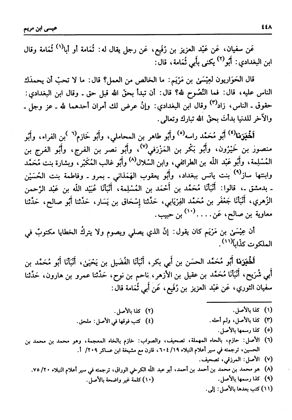 عن سفيان عن عبد العزيز بن رفيع عن رجل يقال له ثمامة أو أبا ثمامة وقال ابن البغدادي أبو يكنى بأبي ثمامة قال قال الحواريون لعيسى بن مريم ما الخالص من العمل قال مالا تحب أن يحمدك الناس عليه قال فما النصوح لله قال أن تبدأ بحق الله قبل حق وقال ابن البغدادي حقوق الناس زاد وقال ابن البغدادي وإن عرض لك أمران إحدهما لله عز وجل والآخر للدنيا بدأت بحق الله تبارك وتعالى أخبرنا أبو محمد راسه وأبو طاهر بن المحاملي وأبو خازم بن الفراء وأبو منصور بن خيرون وأبو بكر بن المزرفي وأبو نصر بن الفرج وأبو الفرج بن المسلمة وأبو عبد الله بن الطرائفي وابن السلال وأبو غالب المكبر وبشارة بنت محمد وابنتها ساز بنت يانس ببغداد وأبو يعقوب الهمذاني بمرو وفاطمة بنت الحسين بدمشق قالوا أنبأنا محمد بن أحمد بن المسلمة أنبانا عبيد الله بن عبد الرحمن الزهري أنبأنا جعفر بن محمد الفريابي حدثنا إسحاق بن يسار حدثنا أبو صالح حدثنا معاوية بن صالح عن بن حبيب أن عيسى بن مريم كان يقول إن الذي يصلي ويصوم ولا يترك الخطايا مكتوب في الملكوت كذابا أخبرنا أبو محمد الحسن بن أبي بكر أنبأنا الفضيل بن يحيى أنبأنا أبو محمد بن أبي شريح أنبأنا محمد بن عقيل بن الأزهر ناحم بن نوح حدثنا عمرو بن هارون حدثنا سفيان الثوري عن عبد العزيز بن رفيع عن أبي ثمامة قال