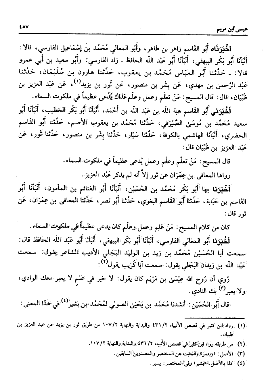 أخبرناه أبو القاسم زاهر بن طاهر وأبو المعالي محمد بن إسماعيل الفارسي قالا أنبأنا أبو بكر البيهقي أنبأنا أبو عبد الله الحافظ زاد الفارسي وأبو سعيد بن أبي عمرو قالا حدثنا أبو العباس محمد بن يعقوب حدثنا هارون بن سليمان حدثنا عبد الرحمن بن مهدي عن بشر بن منصور عن ثور بن يزيد عن عبد العزيز بن ظبيان قال قال المسيح من تعلم وعمل وعلم فذاك يدعى عظيما في ملكوت السماء أخبرني أبو القاسم هبة الله بن عبد الله بن أحمد أنبأنا أبو بكر الخطيب أنبأنا أبو سعيد محمد بن موسى الصيرفي حدثنا محمد بن يعقوب الأصم حدثنا أبو القاسم الحضري أنبأنا الهاشمي بالكوفة حدثنا سيار حدثنا بشر بن منصور حدثنا ثور عن عبد العزيز بن ظبيان قال قال المسيح من تعلم وعلم وعمل يدعى عظيما في ملكوت السماء رواها المعافى بن عمران عن ثور إلا أنه لم يذكر عبد العزيز أخبرنا بها أبو بكر محمد بن الحسين أنبأنا أبو الغنائم بن المأمون أنبأنا أبو القاسم بن حبابة حدثنا أبو القاسم البغوي حدثنا أبو نصر حدثنا المعافى بن عمران عن ثور قال كان من كلام المسيح من علم وعمل وعلم كان يدعى عظيما في ملكوت السماء أخبرنا أبو المعالي الفارسي أنبأنا أبو بكر البيهقي أنبأنا أبو عبد الله الحافظ قال سمعت أبا الحسين محمد بن زيد بن الوليد البجلي الأديب الشاعر يقول سمعت عبد الله بن زيدان البجلي يقول سمعت أبا كريب يقول روي أن روح الله عيسى بن مريم كان يقول لا خير في علم لا يعبر معك الوادي ولا يعبر بك النادي قال أبو الحسين أنشدنا محمد بن يحيى الصولي لمحمد بن بشير في هذا المعنى