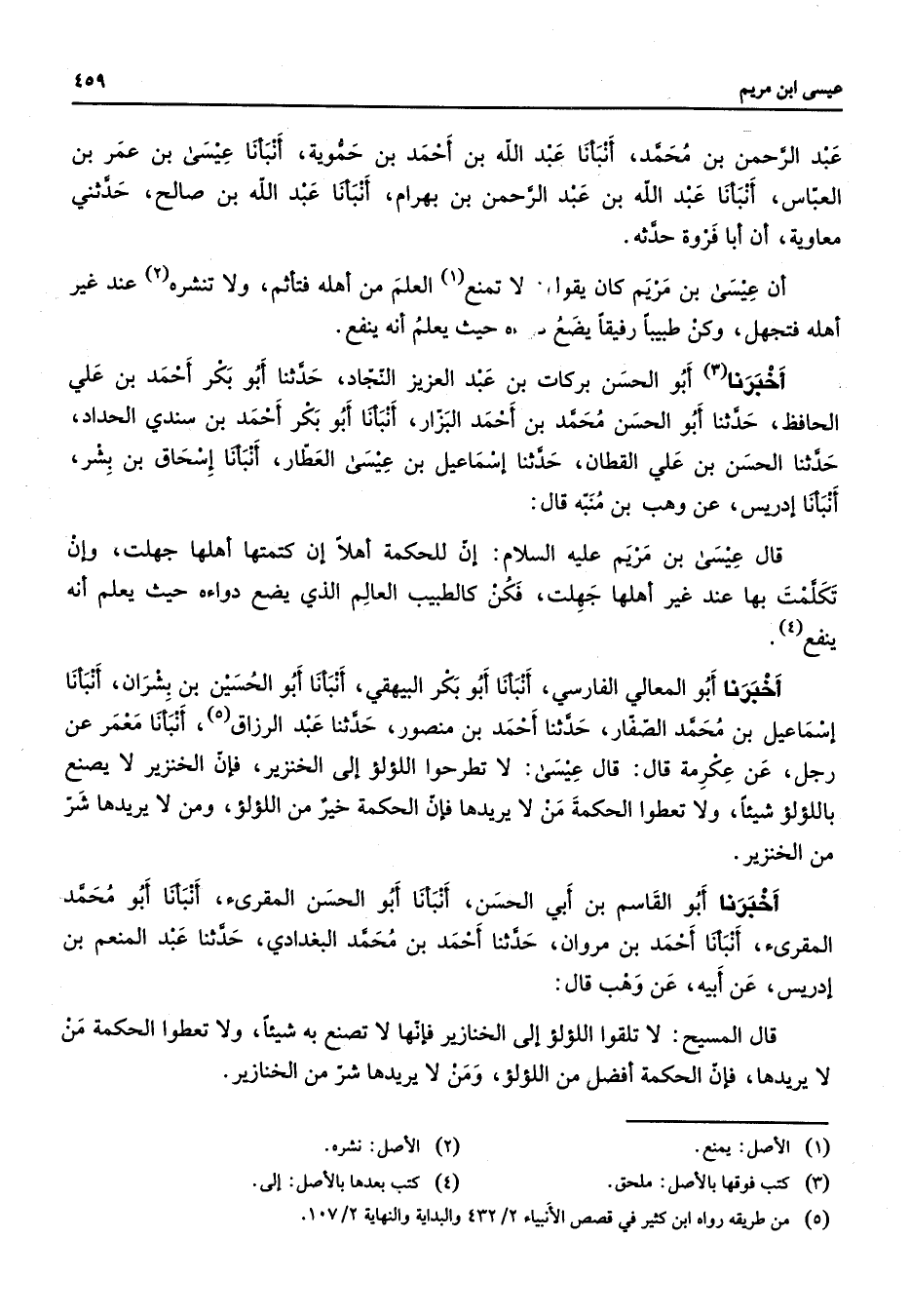 عبد الرحمن بن محمد أنبانا عبد الله بن أحمد بن حموية أنبأنا عيسى بن عمر بن العباس أنبأنا عبد الله بن عبد الرحمن بن بهرام أنبأنا عبد الله بن صالح حدثني معاوية أن أبا فروة حدثه أن عيسى بن مريم كان يقول لا تمنع العلم من أهله فتأثم ولا تنشره عند غير أهله فتجهل وكن طبيبا رفيقا يضع () حيث يعلم أنه ينفع أخبرنا أبو الحسن بركات بن عبد العزيز النجاد حدثنا أبو بكر أحمد بن علي الحافظ حدثنا أبو الحسن محمد بن أحمد البزاز أنبأنا أبو بكر أحمد بن سندي الحداد حدثنا الحسن بن علي القطان حدثنا إسماعيل بن عيسى العطار أنبأنا إسحاق بن بشر أنبأنا إدريس عن وهب بن منبه قال قال عيسى بن مريم عليه السلام إن للحكمة أهلا إن كتمتها أهلها جهلت وإن تكلمت بها عند غير أهلها جهلت فكن كالطبيب العالم الذي يضع دواءه حيث يعلم أنه ينفع أخبرنا أبو المعالي الفارسي أنبأنا أبو بكر البيهقي أنبأنا أبو الحسين بن بشران أنبأنا إسماعيل بن محمد الصفار حدثنا أحمد بن منصور حدثنا عبد الرزاق أنبأنا معمر عن رجل عن عكرمة قال قال عيسى لا تطرحوا اللؤلؤ إلى الخنزير فإن الخنزير لا يصنع باللؤلؤ شيئا ولا تعطوا الحكمة من لا يريدها فإن الحكمة خير من اللؤلؤ ومن لا يريدها شر من الخنزير أخبرنا أبو القاسم بن أبي الحسن أنبأنا أبو الحسن المقرئ أنبأنا أبو محمد المقرئ أنبأنا أحمد بن مروان حدثنا أحمد بن محمد البغدادي حدثنا عبد المنعم بن إدريس عن أبيه عن وهب قال قال المسيح لا تلقوا اللؤلؤ إلى الخنازير فإنها لا تصنع به شيئا ولا تعطوا الحكمة من لا يريدها فإن الحكمة أفضل من اللؤلؤ ومن لا يريدها شر من الخنازير