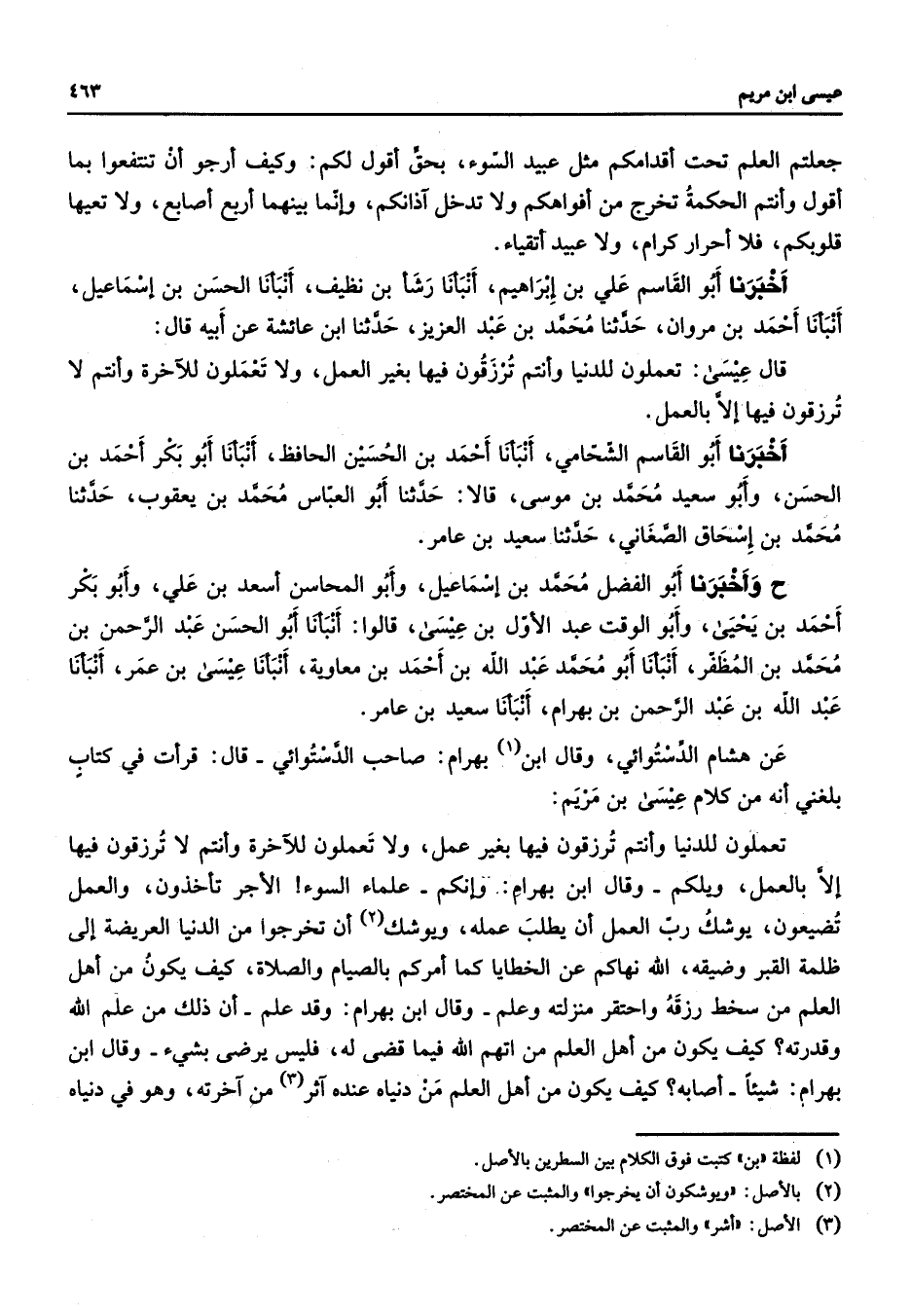 جعلتم العلم تحت أقدامكم مثل عبيد السوء بحق أقول لكم وكيف أرجو أن تنتفعوا بما أقول وأنتم الحكمة تخرج من أفواهكم ولا تدخل آذانكم وإنما بينهما أربع أصابع ولا تعيها قلوبكم فلا أحرار كرام ولا عبيد أتقياء أخبرنا أبو القاسم علي بن إبراهيم أنبأنا رشأ بن نظيف أنبأنا الحسن بن إسماعيل أنبأنا أحمد بن مروان حدثنا محمد بن عبد العزيز حدثنا ابن عائشة عن أبيه قال قال عيسى تعملون للدنيا وأنتم ترزقون فيها بغير العمل ولا تعملون للآخرة وأنتم لا ترزقون فيها إلا بالعمل أخبرنا أبو القاسم الشحامي أنبأنا أحمد بن الحسين الحافظ أنبأنا أبو بكر أحمد بن الحسن وأبو سعيد محمد بن موسى قالا حدثنا أبو العباس محمد بن يعقوب حدثنا محمد بن إسحاق الصغاني حدثنا سعيد بن عامر ح وأخبرنا أبو الفضل محمد بن أسماعيل وأبو المحاسن أسعد بن علي وأبو بكر أحمد بن يحيى وأبو الوقت عبد الأول بن عيسى قالوا أنبأنا أبو الحسن عبد الرحمن بن محمد بن المظفر أنبأنا أبو محمد عبد الله بن أحمد بن معاوية أنبأنا عيسى بن عمر أنبأنا عبد الله بن عبد الرحمن بن بهرام أنبأنا سعيد بن عامر عن هشام الدستوائي وقال ابن بهرام صاحب الدستوائي قال قرأت في كتاب بلغني أنه من كلام عيسى بن مريم تعملون للدنيا وأنتم ترزقون فيها بغير عمل ولا تعملون للآخرة وأنتم لا ترزقون فيها إلا بالعمل ويكلم وقال ابن بهرام وإنكم علماء السوء الأجر تأخذون والعمل تضيعون يوشك رب العمل أن يطلب عمله ويوشك أن تخرجوا من الدنيا العريضة إلى ظلمة القبر وضيقه الله نهاكم عن الخطايا كما أمركم بالصيام والصلاة كيف يكون من أهل العلم من سخط رزقه واحتقر منزلته وعلم وقال ابن بهرام وقد علم أن ذلك من علم الله وقدرته كيف يكون من أهل العلم من اتهم الله فيما قضى له فليس يرضى بشئ وقال ابن بهرام شيئا أصابه كيف يكون من أهل العلم من دنياه عنده آثر من آخرته وهو في دنياه
