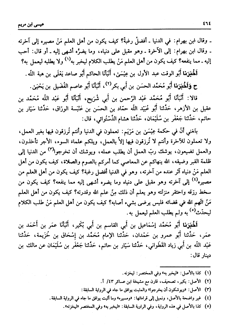 وقال ابن بهرام في الدنيا أفضل رغبة كيف يكون من أهل العلم من مصيره إلى آخرته وقال ابن بهرام إلى الآخرة وهو مقبل على دنياه وما يضره أشهى إليه أو قال أحب إليه مما ينفعه كيف يكون من أهل العلم من يطلب الكلام ليخبر به ولا يطلبه ليعمل به أخبرنا أبو الوقت عبد الأول بن عيسى أنبأنا الحاكم أبو صاعد يعلى بن هبة الله ح وأخبرنا أبو محمد الحسن بن أبي بكر أنبأنا أبو عاصم الفضيل بن يحيى قالا أنبأنا أبو محمد عبد الرحمن بن أبي شريح أنبأنا أبو عبد الله محمد بن عقيل بن الأزهر حدثنا أبو عبيد الله حماد بن الحسن بن عنبسة الوراق حدثنا سيار بن حاتم حدثنا جعفر بن سليمان حدثنا هشام الدستوائي قال بلغني أن في حكمة عيسى بن مريم تعملون في الدنيا وأنتم ترزقون فيها بغير العمل ولا تعملون للآخرة وأنتم ترزقون فيها إلا بالعمل ويلكم علماء السوء الأجر تأخذون والعمل تضيعون يوشك رب العمل أن يطلب عمله ويوشك أن تخرجوا من الدنيا إلى ظلمة القبر وضيقه الله ينهاكم عن المعاصي كما أمركم بالصوم والصلاة كيف يكون من أهل العلم من دنياه آثر عنده من أخرته وهو في الدنيا أفضل رغبة كيف يكون من أهل العلم من مصيره إلى آخرته وهو مقبل على دنياه وما يضره أشهى إليه مما ينفعه كيف يكون من سخط رزقه واحتقر منزلته وهو يعلم أن ذلك من علم الله وقدرته كيف يكون من أهل العلم من اتهم الله في قضائه فليس يرضى بشئ أصابه كيفي يكون من أهل العلم من طلب الكلام ليحدث به ولم يطلب العلم ليعمل به أخبرنا أبو محمد إسماعيل بن أبي القاسم بن أبي بكير أنبأنا عمر بن أحمد بن عمر حدثنا أبو عمرو بن حمدان حدثنا الإمام محمد بن إسحاق بن خزيمة حدثنا عبد الله بن أبي زياد القطواني حدثنا سيار بن حاتم حدثنا جعفر بن سليمان عن مالك بن دينار قال
