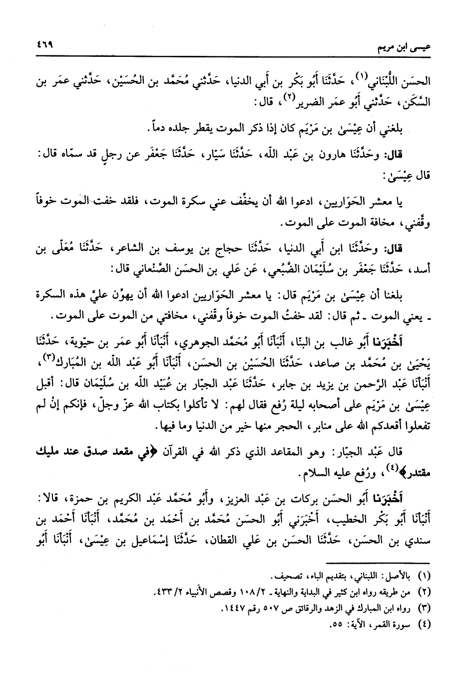 الحسن اللبناني حدثنا أبو بكر بن أبي الدنيا حدثني محمد بن الحسين حدثني عمر بن السكن حدثني أبو عمر الضرير قال بلغني أن عيسى بن مريم كان إذا ذكر الموت يقطر جلده دما قال وحدثنا هارون بن عبد الله حدثنا سيار حدثنا جعفر عن رجل قد سماه قال قال عيسى يا معشر الحواريين ادعوا الله أن يخفف عني سكرة الموت فلقد خفت الموت خوفا وقفني مخافة الموت على الموت قال وحدثنا ابن أبي الدنيا حدثنا حجاج بن يوسف بن الشاعر حدثنا معلى بن أسد حدثنا جعفر بن سليمان الضبعي عن علي بن الحسن الصنعاني قال بلغنا أن عيسى بن مريم قال يا معشر الحواريين ادعوا الله أن يهون علي هذه السكرة يعني الموت ثم قال لقد خفت الموت خوفا وقفني مخافتي من الموت على الموت أخبرنا أبو غالب بن البنا أنبأنا أبو محمد الجوهري أنبأنا أبو عمر بن حيوية حدثنا يحيى بن محمد بن صاعد حدثنا الحسين بن الحسن أنبأنا أبو عبد الله بن المبارك أنبأنا عبد الرحمن بن يزيد عن جابر حدثنا عبد الجبار بن عبيد الله بن سليمان قال أقبل عيسى بن مريم على أصحابه ليلة رفع فقال لهم لا تأكلوا بكتاب الله عز وجل فإنكم إن لم تفعلوا أقعدكم الله على منابر الحجر منها خير من الدنيا وما فيها قال عبد الجبار وهو المقاعد الذي ذكر الله في القرآن " في مقعد صدق عند مليك مقتدر ورفع عليه السلام أخبرنا أبو الحسن بركات بن عبد العزيز وأبو محمد عبد الكريم بن حمزة قالا أنبأنا أبو بكر الخطيب أخبرني أبو الحسن محمد بن أحمد بن محمد أنبأنا أحمد بن سندي بن الحسن حدثنا الحسن بن علي القطان حدثنا إسماعيل بن عيسى أنبأنا أبو