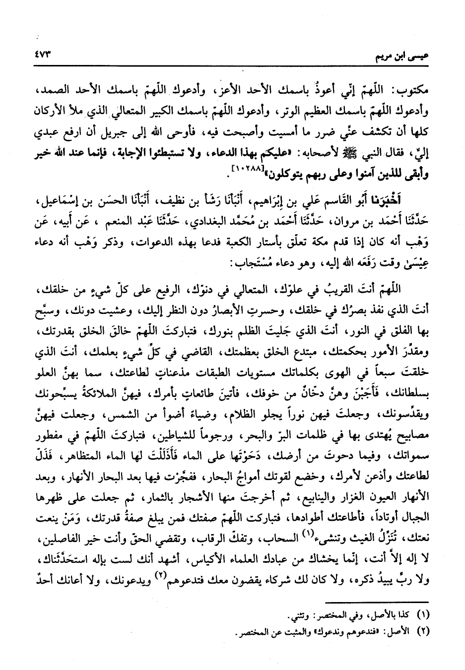 مكتوب اللهم إني أعوذ باسمك الأحد الأعز وأدعوك اللهم باسمك الأحد الصمد وأدعوك اللهم باسمك العظيم الوتر وأدعوك اللهم باسمك الكبير المتعالي الذي ملأ الأركان كلها أن تكشف عني ضرر ما أمسيت وأصبحت فيه فأوحى الله إلى جبريل أن ارفع عبدي إلي فقال النبي (صلى الله عليه وسلم) لأصحابه عليكم بهذا الدعاء ولا تستبطئوا الإجابة فإنما عند الله خير وأبقى للذين آمنوا وعلى ربهم يتوكلون أخبرنا أبو القاسم علي بن إبراهيم أنبأنا رشأ بن نظيف أنبأنا الحسن بن إسماعيل حدثنا أحمد بن مروان حدثنا أحمد بن محمد البغدادي حدثنا عبد المنعم عن أبيه عن وهب أنه كان إذا قدم مكة تعلق بأستار الكعبة فدعا بهذ الدعوات وذكر وهب أنه دعاء عيسى وقت رفعه الله إليه وهو دعاء مستجاب اللهم أنت القريب في علوك المتعالي في دنوك الرفيع على كل شئ من خلقك أنت الذي نفذ بصرك في خلقك وحسرت الأبصار دون النظر إليك وعشيت دونك وسبح بها الفلق في النور أنت الذي جليت الظلم بنورك فتباركت اللهم خالق الخلق بقدرتك ومقدر الأمور بحكمتك مبتدع الخلق بعظمتك القاضي في كل شئ بعلمك أنت الذي خلقت سبعا في الهوى بكلماتك مستويات الطبقات مذعنات لطاعتك سما بهن العلو بسلطانك فأجبن وهن دخان من خوفك فأتين طائعات بأمرك فيهن الملائكة يسبحونك ويقدسونك وجعلت فيهن نورا يجلو الظلام وضياء أضوأ من الشمس وجعلت فيهن مصابيح يهتدي بها في ظلمات البر والبحر ورجوما للشياطين فتباركت اللهم في مفطور سمواتك وفيما دحوت من أرضك دحوتها على الماء فأذللت لها الماء المتظاهر فذل لطاعتك وأذعن لأمرك وخضع لقوتك أمواج البحار ففجرت فيها بعد البحار الأنهار وبعد الأنهار العيون الغزاز والينابيع ثم أخرجت منها الأشجار بالثمار ثم جعلت على ظهرها الجبال أوتادا فأطاعتك أطوادها فتباركت اللهم صفتك فمن يبلغ صفة قدرتك ومن ينعت نعتك تنزل الغيث وتنشئ السحاب وتفك الرقاب وتقضي الحق وأنت خير الفاصلين لاإله إلا أنت إنما يخشاك من عبادك العلماء الأكياس أشهد أنك لست بإله استحدثناك ولا رب يبيد ذكره ولا كان لك شركاء يقضون معك فتدعوهم ويدعونك ولا أعانك أحد