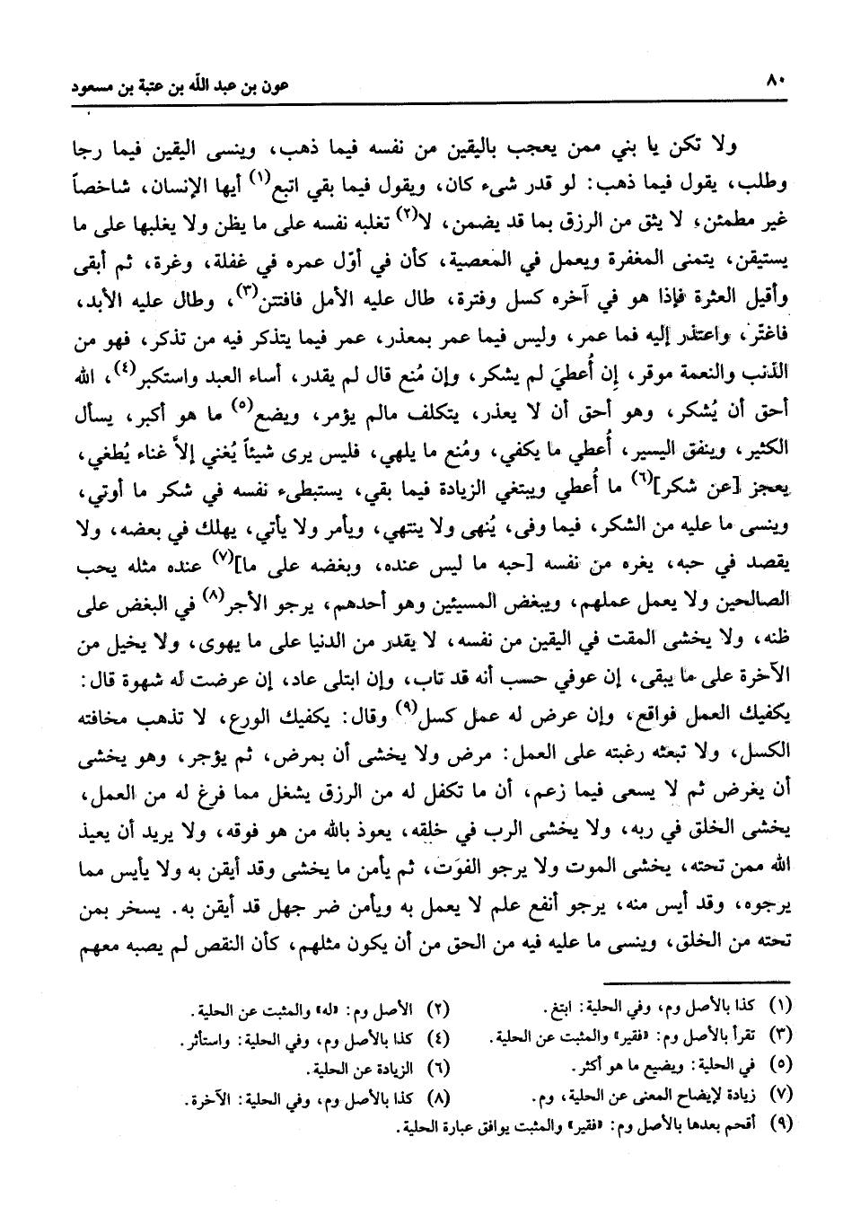 ولا تكن يا بني ممن يعجب باليقين من نفسه فيما ذهب وينسى اليقين فيما رجا وطلب يقول فيما ذهب لو قدر شئ كان ويقول فيما بقي اتبع أيها الإنسان شاخصا غير مطمئن لا يثق من الرزق بما قد يضمن لا تغلبه نفسه على ما يظن ولا يغلبها على ما يستقين يتمنى المغفرة ويعمل في المعصية كأن في أول عمره في غفلة وغرة ثم أبقى وأقيل العثرة فإذا هو في آخره كسل وفترة طال عليه الأمل فافتتن وطال عليه الأبد فاغتر واعتذر إليه فما عمر وليس فيما عمر بمعذر عمر فيما يتذكر فيه من تذكر فهو من الذنب والنعمة موقر إن أعطي لم يشكر وإن منع قال لم يقدر أساء العبد واستكبر الله أحق أن يشكر وهو أحق أن لا يعذر يتكلف ما لم يؤمر ويضع ما هو أكبر يسأل الكثير وينفق اليسير أعطي ما يكفي ومنع ما يلهي فليس يرى شيئا يغني إلا غناء يطغي يعجز عن شكر ما أعطي ويبتغي الزيادة فيما بقي يستبطئ نفسه في شكر ما أوتي وينسى ما عليه من الشكر فيما وفي ينهى ولا ينتهي ويأمر ولا يأتي يهلك في بعضه ولا يقصد في تحبه يغره من نفسه حبه ما ليس عنده وبغضه على ما عنده مثله يحب الصالحين ولا يعمل عملهم ويبغض المسيئين وهو أحدهم يرجو الأجر في البغض على ظنه ولا يخشى المقت في اليقين من نفسه لا يقدر من الدنيا على ما يهوى ولا يخيل من الآخرة على ما يبقى إن عوفي حسب أنه قد تاب وإن ابتلى عاد إن عرضت له شهوة قال يكفيك العمل فواقع وإن عرض له عمل كسل وقال يكفيك الورع لا تذهب مخافته الكسل ولا تبعثه رغبته على العمل مرض ولا يخشى أن بمرض ثم يؤجر وهو يخشى أن يغرض ثم لا يسعى فيما زعم أن ما تكفل له من الرزق يشغل مما فرغ له من العمل يخشى الخلق في ربه ولا يخشى الرب في خلقه يعوذ بالله من هو فوقه ولا يريد أن يعيذ الله ممن تحته يخشى الموت ولا يرجو الفوت ثم يأمن ما يخشى وقد أيقن به ولا يأيس مما يرجوه وقد أيس منه يرجو أنفع علم لا يعمل به ويأمن ضر جهل قد أيقن به يسخر بمن تحته من الخلق وينسى ما عليه فيه من الحق من أن يكون مثلهم كأن النقص لم يصبه معهم