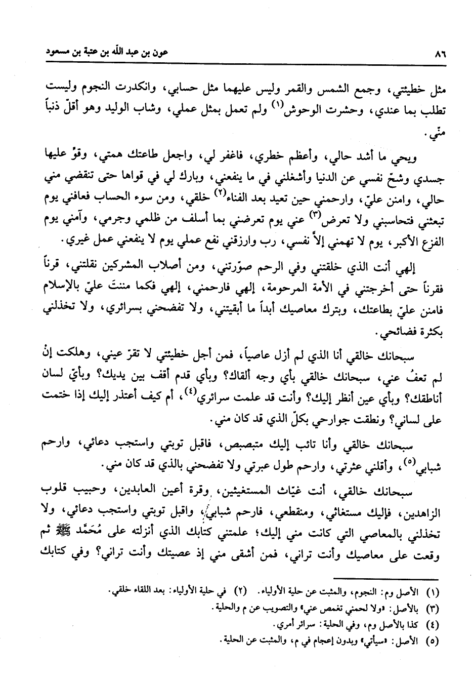 مثل خطيئتي وجمع الشمس والقمر وليس عليهما مثل حسابي وانكدرت النجوم وليست تطلب بما عندي وحشرت الوحوش ولم تعمل بمثل عملي وشاب الوليد وهو أقل ذنبا مني ويحي ما أشد حالي واعظم خطري فاغفر لي واجعل طاعتك همتي وقو عليها جسدي وشح نفسي عن الدنيا وأشغلني في ما ينفعني وبارك لي في قواها حتى تنقضي مني حالي وامنن علي وارحمني حين تعيد بعد الفناء خلقي ومن سوء الحساب فعافني يوم تبعثني فتحاسبني ولا تعرض عني يوم تعرضني بما أسلف من ظلمي وجرمي وآمني يوم الفزع الأكبر يوم لا تهمني إلا نفسي رب وارزقني نفع عملي يوم لا ينفعني عمل غيري إلهي أنت الذي خلقتني وفي الرحم صورتني ومن أصلاب المشركين نقلتني قرنا فقرنا حتى أخرجتني في الأمة المرحومة إلهي فارحمني إلهي فكما مننت علي بالإسلام فامنن علي بطاعتك وبترك معاصيك أبدا ما ابقيتني ولا تفضحني بسرائري ولا تخذلني بكثرة فضائحي سبحانك خالقي أنا الذي لم ازل عاصيا فمن اجل خطيئتي لا تقر عيني وهلكت إن إ لم تعف عني سبحانك خالقي بأي وجه ألقاك وبأي قدم أقف بين يديك وبأي لسان أناطقك وبأي عين أنظر إليك وأنت قد علمت سرائري أم كيف أعتذر إليك إذا ختمت على لساني ونطقت جوارحي بكل الذي قد كان مني سبحانك خالقي وأنا تائب إليك متبصبص فاقبل توبتي واستجب دعائي وارحم شبابي وأقلني عثرتي وارحم طول عبرتي ولا تفضحني بالذي قد كان مني سبحانك خالقي أنت غياث المستغيثين وقرة أعين العابدين وحبيب قلوب الزاهدين فإليك مستغاثي ومنقطعي فارحم شبابي واقبل توبتي واستجب دعائي ولا تخذلني بالمعاصي التي كانت مني إليك علمتني كتابك الذي أنزلته على محمد (صلى الله عليه وسلم) ثم وقعت على معاصيك وأنت تراني فمن اشقى مني إذ عصيتك وأنت تراني وفي كتابك