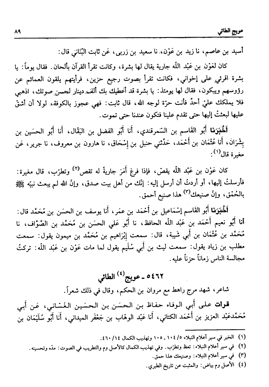 5462 - عويج الطائي شاعر شهد مرج راهط مع مروان بن الحكم وقال في ذلك شعرا قرأت على أبي الوفاء حفاظ بن الحسن بن الحسن الغساني عن أبي محمد عبد العزيز بن أحمد الكتاني أنا عبد الوهاب بن جعفر الميداني أنا أبو سليمان بن