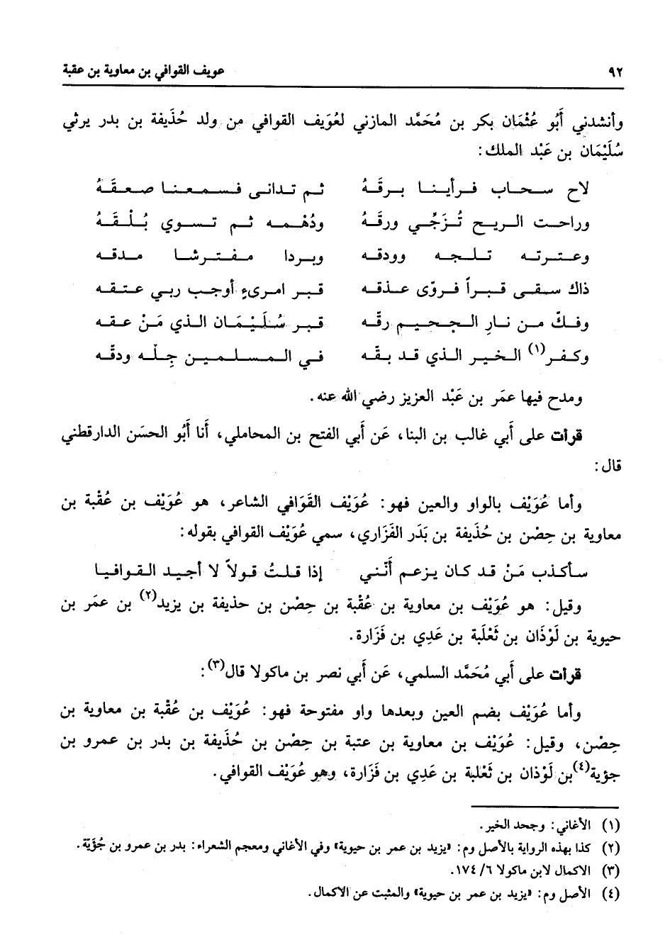 وأنشدني أبو عثمان بكر بن محمد المازني لعويف القوافي من ولد حذيفة بن بدر يرثي سليمان بن عبد الملك لاح سحاب فرأينا برقه * ثم تدانى فسمعنا صعقه وراحت الريح تزجي ورقه * ودهمه ثم تسوي بلقه وعترته تلجه وودقه * وبردا مفترشا مدقه ذاك سقى قبرا فروى عذقه * قبر امرئ أوجب ربي عتقه وفك من نار الجحيم رقه * قبر سليمان الذي من عقه وكفر الخير الذي قد بقه * في المسلمين جله ودقه ومدح فيها عمر بن عبد العزيز Bهـ قرأت على أبي غالب بن البنا عن أبي الفتح بن المحاملي أنا أبو الحسن الدارقطني قال وأما عويف بالواو والعين فهو عويف القوافي الشاعر هو عويف بن عقبة بن معاوية بن حصن بن حذيفة بن بدر الفزاري سمي عويف القوافي بقوله سأكذب من قد كان يزعم أنني * إذا قلت قولا لا أجيد القوافيا * وقيل هو عويف بن معاوية بن عقبة بن حصن بن حذيفة بن يزيد بن عمر بن حيوية بن لوذان بن ثعلبة بن عدي بن فزارة قرأت على أبي محمد السلمي عن أبي نصر بن ماكولا قال وأما عويف بضم العين وبعدها واو مفتوحة فهو عويف بن عقبل بن معاوية بن حصن وقيل عويف بن معاوية بن عتبة بن حصن بن حذيفة بن بدر بن عمربن جؤية بن لوذان بن ثعلبة بن عدي بن فزارة وهو عويف القوافي
