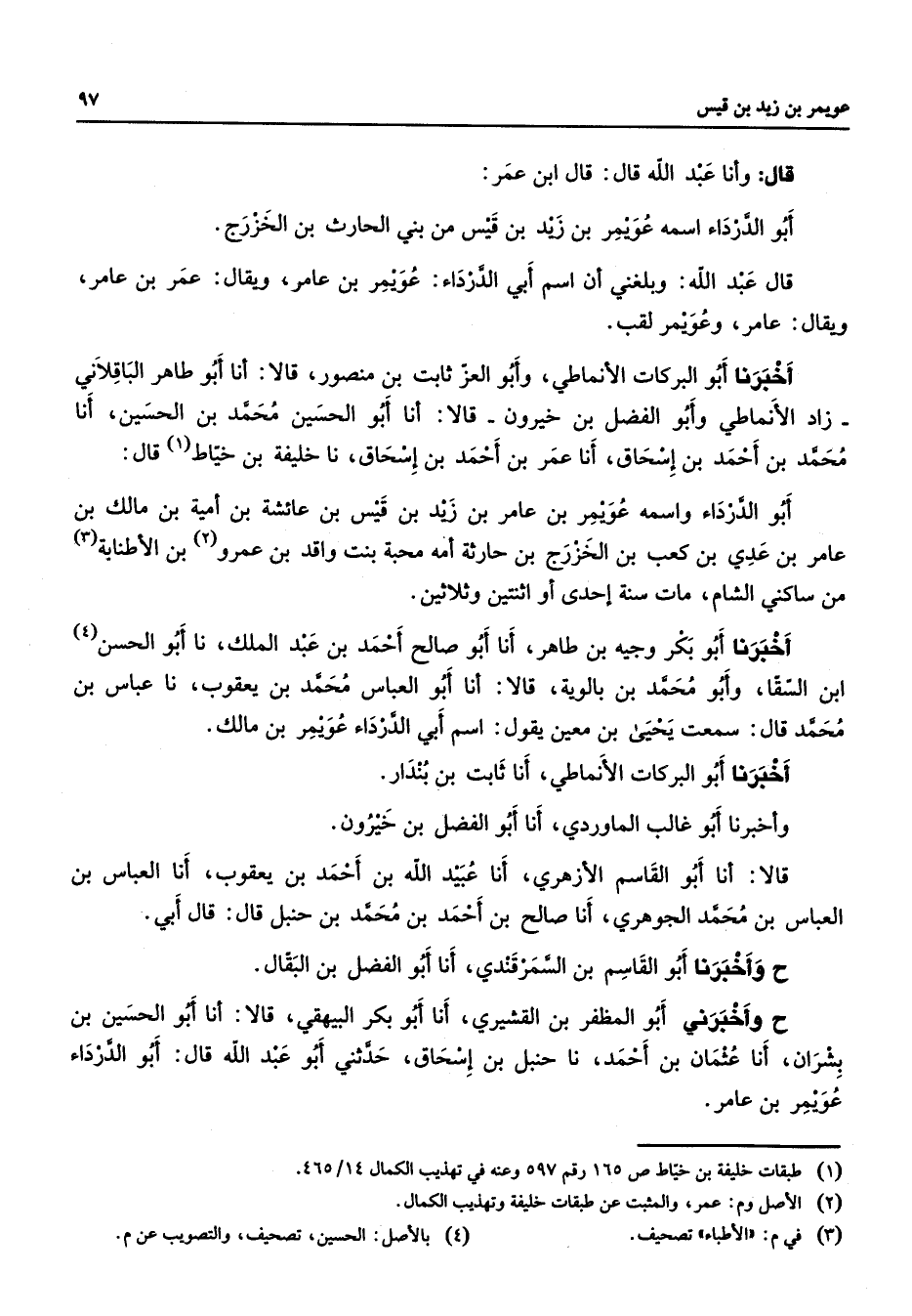 قال وأنا عبد الله قال قال ابن عمر أبو الدرداء اسمه عويمر بن زيد بن قيس من بني الحارث بن الخزرج قال عبد الله وبلغني أن اسم أبي الدرداء عويمر بن عامر ويقال عمر بن عامر ويقال عامر وعويمر لقب أخبرنا أبو البركات الأنماطي وأبو العز ثابت بن منصور قالا أنا أبو طاهر الباقلاني زاد النماطي وأبو الفضل بن خيرون قالا أنا أبو الحسين محمد بن الحسين أنا محمد بن أحمد بن إسحاق أنا عمر بن أحمد بن إسحاق نا خليفة بن خياط قال أبو الدرداء واسمه عويمر بن عامر بن زيد بن قيس بن عائشة بن أمية بن مالك بن عامر بن عدي بن كعب بن الخزرج بن حارثة أمه محبة بنت واقد بن عمرو بن الأطنابة من ساكني الشام مات سنة إحدى أو اثنتين وثلاثين أخبرنا أبو بكر وجيه بن طاهر أنا أبو صالح أحمد بن عبد الملك نا أبو الحسن ابن السقا وأبو محمد بالوية قالا أنا أبو العباس محمد بن يعقوب نا عباس بن محمد قال سمعت يحيى بن معين يقول اسم أبي الدرداء عويمر بن مالك أخبرنا أبو البركات الأنماطي أنا ثابت بن بندار وأخبرنا أبو غالب الماوردي أنا أبو الفضل بن خيرون قالا أنا أبو القاسم الأزهري أنا عبيد الله بن أحمد بن يعقوب أنا العباس بن العباس بن محمد الجوهري أنا صالح بن أحمد بن محمد بن حنبل قال قال أبي ح وأخبرنا أبو القاسم بن السمرقندي أنا أبو الفضل بن البقال ح وأخبرني أبو المظفر بن القشيري أنا أبو بكر البيهقي قالا أنا أبو الحسين بن بشران أنا عثمان بن أحمد نا حنبل بن إسحاق حدثني أبو عبد الله قال أبو الدرداء عويمر بن عامر