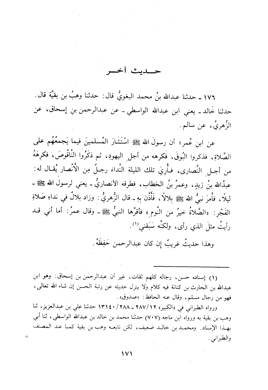 176 - حَدَّثَنَا عَبْدُ اللَّهِ بْنُ مُحَمَّدٍ الْبَغَوِيُّ، قَالَ: حَدَّثَنَا وَهْبُ بْنُ بَقِيَّةَ، قَالَ: حَدَّثَنَا خَالِدٌ يَعْنِي: ابْنُ عَبْدِ اللَّهِ الْوَاسِطِيُّ، عَنْ عَبْدِ الرَّحْمَنِ بْنِ إِسْحَاقَ، عَنِ الزُّهْرِيِّ، عَنْ سَالِمٍ، عَنِ ابْنِ عُمَرَ، أَنَّ رَسُولَ اللَّهِ صَلَّى اللهُ عَلَيْهِ وَسَلَّمَ §" اسْتَشَارَ الْمُسْلِمِينَ فِيمَا يَجْمَعُهُمْ عَلَى الصَّلَاةِ فَذَكَرُوا الْبُوقَ فَكَرِهَهُ مِنْ أَجْلِ الْيَهُودِ، ثُمَّ ذَكَرُوا النَّاقُوسَ فَكَرِهَهُ مِنْ أَجْلِ النَّصَارَى، فَأُرِيَ تِلْكَ اللَّيْلَةَ النِّدَاءَ رَجُلٌ مِنَ الْأَنْصَارِ يُقَالُ لَهُ: عَبْدُ اللَّهِ بْنُ زَيْدٍ، وَعُمَرُ بْنُ الْخَطَّابِ، فَطَرَقَهُ الْأَنْصَارِيُّ يَعْنِي لِرَسُولِ اللَّهِ صَلَّى اللهُ عَلَيْهِ وَسَلَّمَ لَيْلًا، فَأَمَرَ نَبِيُّ اللَّهِ صَلَّى اللهُ عَلَيْهِ وَسَلَّمَ بِلَالًا فَأَذَّنَ بِهِ قَالَ الزُّهْرِيُّ: وَزَادَ بِلَالٌ فِي نِدَاءِ صَلَاةِ الْفَجْرِ: الصَّلَاةُ خَيْرٌ مِنَ النَّوْمِ، فَأَقَرَّهَا النَّبِيُّ صَلَّى اللهُ عَلَيْهِ وَسَلَّمَ، وَقَالَ عُمَرُ: أَمَا إِنِّي قَدْ رَأَيْتُ مِثْلَ الَّذِي رَأَى وَلَكِنَّهُ سَبَقَنِي " وَهَذَا حَدِيثٌ غَرِيبٌ إِنْ كَانَ عَبْدُ الرَّحْمَنِ حِفْظَهُ 0 -[172]- وَقَدْ خَالَفَ أَصْحَابُ الزُّهْرِيِّ؛ يُونُسُ، وَشُعَيْبُ بْنُ أَبِي حَمْزَةَ، وَمَعْمَرٌ، وَمُحَمَّدُ بْنُ إِسْحَاقَ، وَابْنُ جُرَيْجٍ كُلُّهُمْ رَوَى عَنِ الزُّهْرِيِّ، عَنْ سَعِيدِ بْنِ الْمُسَيِّبِ