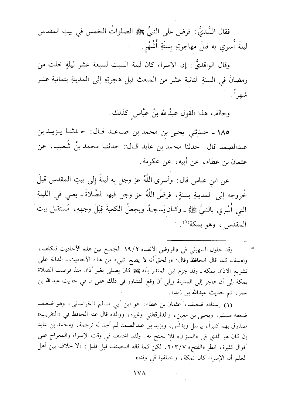 185 - حَدَّثَنِي يَحْيَى بْنُ مُحَمَّدِ بْنِ صَاعِدٍ، قَالَ: حَدَّثَنِي يَزِيدُ بْنُ عَبْدِ الصَّمَدِ، قَالَ: حَدَّثَنَا مُحَمَّدُ بْنُ عَائِذٍ، قَالَ: حَدَّثَنَا مُحَمَّدُ بْنُ شُعَيْبٍ، عَنْ عُثْمَانَ بْنِ عَطَاءٍ، عَنْ أَبِيهِ، عَنْ عِكْرِمَةَ، عَنِ ابْنِ عَبَّاسٍ، قَالَ: §«وَأَسْرَى اللَّهُ عَزَّ وَجَلَّ بِهِ لَيْلَةً إِلَى بَيْتِ الْمَقْدِسِ قَبْلَ خُرُوجِهِ إِلَى الْمَدِينَةِ بِسَنَةٍ، فَرَضَ اللَّهُ عَزَّ وَجَلِّ فِيهَا الصَّلَاةَ يَعْنِي فِي اللَّيْلَةِ الَّتِي أُسْرَيَ بِالنَّبِيِّ صَلَّى اللهُ عَلَيْهِ وَسَلَّمَ وَكَانَ يَسْجُدُ وَيَجْعَلُ الْكَعْبَةَ قِبَلَ وَجْهِهِ مُسْتَقْبِلَ بَيْتِ الْمَقْدِسِ وَهُوَ بِمَكَّةَ» -[179]- فَقَدْ صَحَّ أَنَّ الْإِسْرَاءَ كَانَ بِمَكَّةَ، وَأَمَّا حَدِيثُ الْأَذَانِ مَعَ عَبْدِ اللَّهِ بْنِ زَيْدٍ الْأَنْصَارِيِّ، وَعُمَرَ بْنِ الْخَطَّابِ فَإِنَّهُ كَانَ بِالْمَدِينَةِ