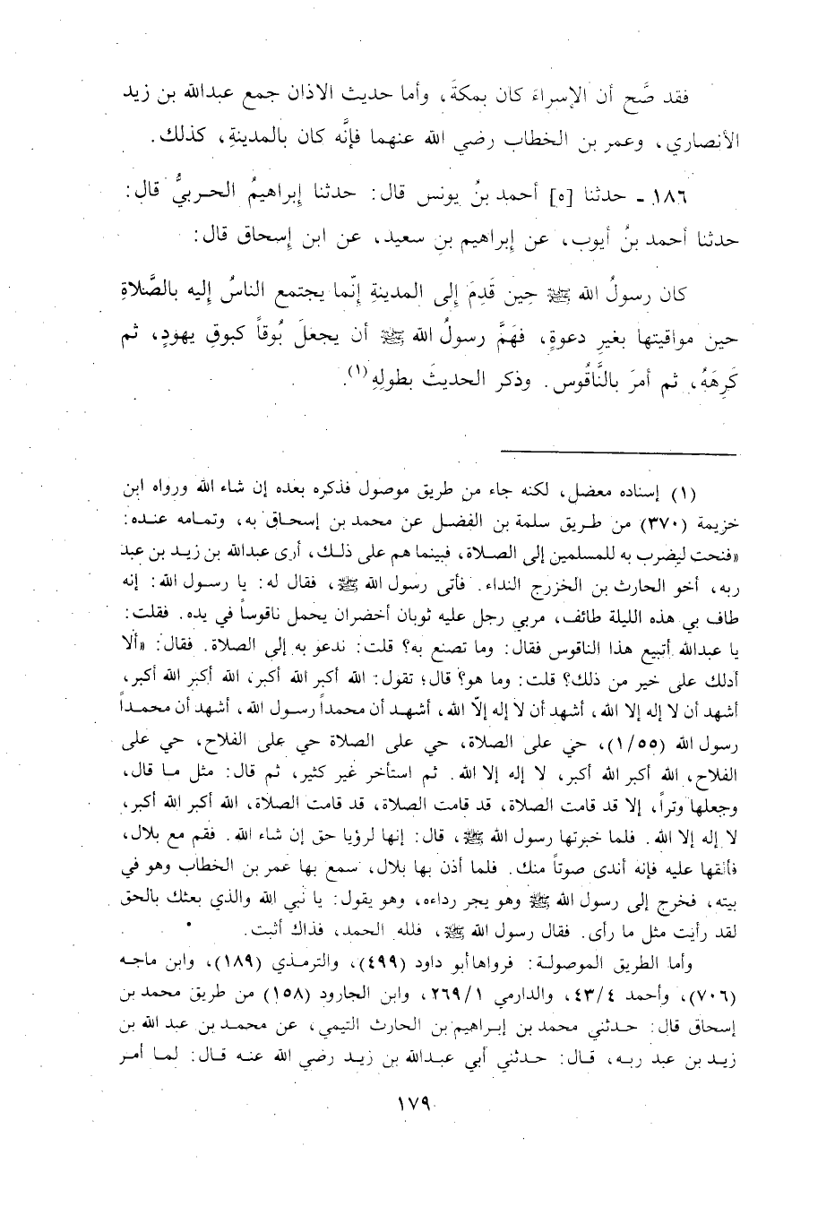 186 - حَدَّثَنَا أَحْمَدُ بْنُ يُونُسَ، قَالَ: حَدَّثَنَا إِبْرَاهِيمُ الْحَرْبِيُّ، قَالَ: حَدَّثَنَا أَحْمَدُ بْنُ أَيُّوبَ، عَنْ إِبْرَاهِيمَ بْنِ سَعْدٍ، عَنِ ابْنِ إِسْحَاقَ، قَالَ: كَانَ رَسُولُ اللَّهِ صَلَّى اللهُ عَلَيْهِ وَسَلَّمَ حِينَ قَدِمَ إِلَى الْمَدِينَةِ إِنَّمَا §«يَجْتَمِعُ النَّاسُ إِلَيْهِ لِلصَّلَاةِ حِينَ مَوَاقِيتِهَا بِغَيْرِ دَعْوَةٍ فَهَّمَ رَسُولُ اللَّهِ صَلَّى اللهُ عَلَيْهِ وَسَلَّمَ أَنْ يَجْعَلَ بُوقًا كَبُوقِ الْيَهُودِ، ثُمَّ كَرِهَهُ، ثُمَّ أَمَرَ بِالنَّاقُوسِ وَذَكَرَ الْحَدِيثَ بِطُولِهِ» -[180]- وَقَدْ ذُكِرَ فِي بَعْضِ حَدِيثِ أَنَسٍ، أَنَّهُمْ هَمُّوا أَنْ يُنَوِّرُوا نَارًا، وَقِيلَ هَمُّوا أَنْ يَنْصُبُوا عَلَمًا حَتَّى رَأْي عَبْدُ اللَّهِ بْنُ زَيْدٍ، وَعُمَرُ بْنُ الْخَطَّابِ أَمْرَ الْأَذَانِ 0 فَإِنْ صَحَّ الْحَدِيثُ فِي أَمْرِ الْأَذَانِ فِي لَيْلَةِ الْمِعْرَاجِ، فَمَا وَجْهُ هَذَا؟ وَالَّذِي عَلَيْهِ أَكْثَرُ أَهْلِ الْعِلْمِ حَدِيثُ عَبْدِ اللَّهِ بْنِ زَيْدٍ وَأَمَّا الْأَذَانُ فَلَيْسَ مِنْ فُرُوضِ الصَّلَاةِ؛ لِأَنَّ فَرْضَ الصَّلَوَاتِ الْخَمْسِ فُرِضَتْ فِي لَيْلَةِ الْمِعْرَاجِ -[181]-، الْمِعْرَاجُ فِيهِ حَدِيثٌ صَحِيحُ السَّنَدِ رَوَاهُ عَنُ رَسُولِ اللَّهِ صَلَّى اللهُ عَلَيْهِ وَسَلَّمَ جَمَاعَةٌ قَدْ ذَكَرْنَاهُمْ فِي أَوَّلِ كِتَابِ الْمِعْرَاجِ، وَلَكِنْ فِي حَدِيثِ الْمِعْرَاجِ طُرُقٌ وَكَلَامٌ يُنْظَرُ فِيهِ، لَا يُطْلَقُ عَلَى الصِّحَّةِ، وَأَمَّا الْحَدِيثُ فِي نَفْسِهِ فَلَا يَرُدُّهُ مَنْ صَحَّ إِيمَانُهُ وَإِسْلَامُهُ وَاللَّهُ أَعْلَمُ