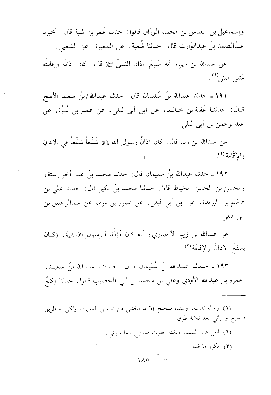 191 - حَدَّثَنَا عَبْدُ اللَّهِ بْنُ سُلَيْمَانَ، قَالَ: حَدَّثَنَا عَبْدُ اللَّهِ بْنُ سَعِيدٍ الْأَشَجُّ، قَالَ: حَدَّثَنَا عُقْبَةُ بْنُ خَالِدٍ، عَنِ ابْنِ أَبِي لَيْلَى، عَنْ عُمَرَ بْنِ مُرَّةَ، عَنْ عَبْدِ الرَّحْمَنِ بْنِ أَبِي لَيْلَى، عَنْ عَبْدِ اللَّهِ بْنِ زَيْدٍ، قَالَ: كَانَ §«أَذَانُ رَسُولِ اللَّهِ صَلَّى اللهُ عَلَيْهِ وَسَلَّمَ شَفْعًا شَفْعًا فِي الْأَذَانِ وَالْإِقَامَةِ»