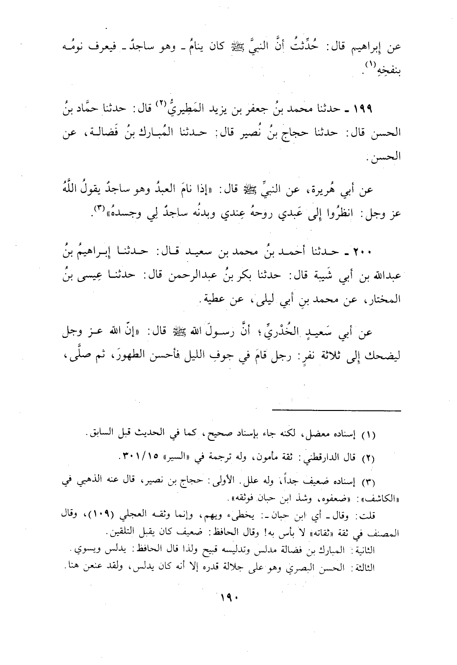 200 - حَدَّثَنَا أَحْمَدُ بْنُ مُحَمَّدِ بْنِ سَعِيدٍ، قَالَ: حَدَّثَنَا إِبْرَاهِيمُ بْنُ عَبْدِ اللَّهِ بْنِ أَبِي شَيْبَةَ، قَالَ: حَدَّثَنَا بَكْرُ بْنُ عَبْدِ الرَّحْمَنِ، قَالَ: حَدَّثَنَا عِيسَى بْنُ الْمُخْتَارِ، عَنْ مُحَمَّدِ بْنِ أَبِي لَيْلَى، عَنْ عَطِيَّةَ، عَنْ أَبِي سَعِيدٍ الْخُدْرِيِّ،: أَنَّ رَسُولَ اللَّهِ صَلَّى اللهُ عَلَيْهِ وَسَلَّمَ قَالَ: إِنَّ " §اللَّهَ عَزَّ وَجَلَّ لَيَضْحَكُ إِلَى ثَلَاثَةِ نَفَرٍ: رَجُلٌ قَامَ فِي جَوْفِ اللَّيْلِ فَأَحْسَنَ الطُّهُورَ، ثُمَّ صَلَّى -[191]-، وَرَجُلٌ نَامَ وَهُوَ سَاجِدٌ، وَرَجُلٌ يَحْمِي كَتِيبَةً مُنْهَزِمَةً فَهُوَ عَلَى فَرَسٍ جَوَادٍ لَوْ شَاءَ أَنْ يَذْهَبَ لَذَهَبَ " قَالَ الشَّيْخُ: وَهَذَا الْبَابُ فِيهِ تَأَمُّلٌ لِمَنْ عَرَفَ أَمَّا حَدِيثُ عَمْرِو ابْنِ شُعَيْبٍ فَلَيْسَ بِمَرْضِيِّ الْإِسْنَادِ؛ لَأَنَّ صَدَقَةَ بْنَ عَبْدِ اللَّهِ هَذَا يُعْرَفُ بِالدِّمَشْقِيِّ أَبُو مُعَاوِيَةَ السَّمِينُ لَيْسَ بِحُجَّةٍ عَلَى غَيْرِهِ، وَقَدْ ضَعَّفَهُ يَحْيَى بْنُ مَعِينٍ، وَأَحْمَدُ بْنُ حَنْبَلٍ، فَإِنْ صَحَّ الْحَدِيثُ فَمَعْنَاهُ وَاللَّهُ أَعْلَمُ أَنَّ مَنْ نَامَ سَاجِدًا فِي صَلَاةِ الْفَرْضِ وَأَمَّا حَدِيثُ أَبِي الْعَالِيَةِ، عَنِ ابْنِ عَبَّاسٍ، فَإِنْ صَحَّ؛ فَمَعْنَاهُ وَاللَّهُ أَعْلَمُ لَيْسَ عَلَى مَنْ نَامَ سَاجِدًا وَضُوءٌ حَتَّى يَضْطَجِعَ يَعْنِي فِي النَّوَافِلِ وَيُصَدِّقُ ذَلِكَ مَا رَوَى الْحَسَنُ، عَنْ أَبِي هُرَيْرَةَ، عَنِ النَّبِيِّ صَلَّى اللهُ عَلَيْهِ وَسَلَّمَ قَالَ: «إِذَا نَامَ الْعَبْدُ وَهُوَ سَاجِدٌ يَقُولُ اللَّهُ عَزَّ وَجَلَّ انْظُرُوا إِلَى عَبْدِي» هَذَا يَعْنِي فِي النَّوَافِلِ وَصَلَاةِ اللَّيْلِ، وَكَذَا سَائِرُ الْأَحَادِيثِ