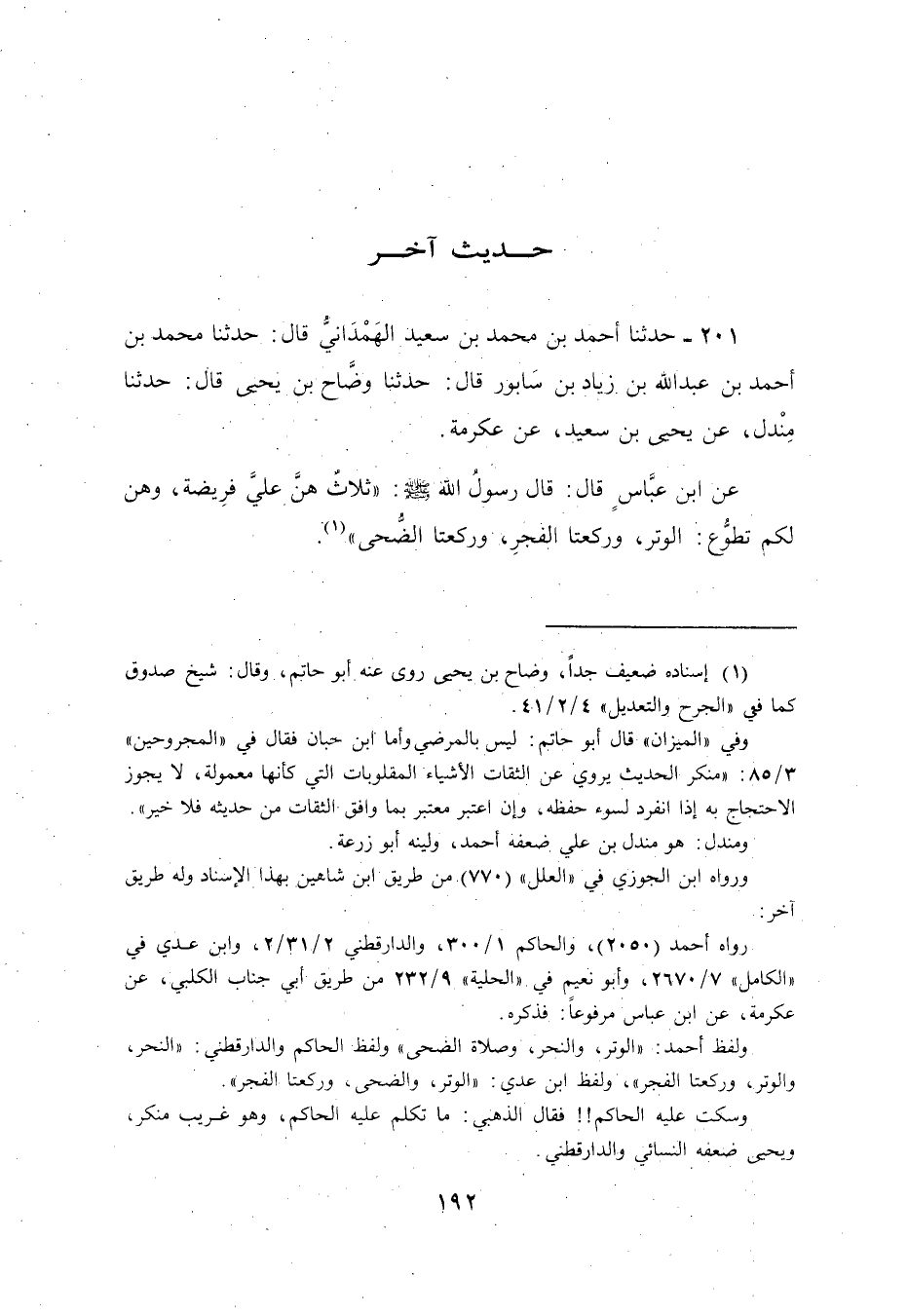 201 - حَدَّثَنَا أَحْمَدُ بْنُ مُحَمَّدِ بْنِ سَعِيدٍ الْهَمْدَانِيُّ، قَالَ: حَدَّثَنَا مُحَمَّدُ بْنُ أَحْمَدَ بْنِ عَبْدِ اللَّهِ بْنِ زِيَادِ بْنِ سَابُورَ، قَالَ: حَدَّثَنَا وَضَّاحُ بْنُ يَحْيَى، قَالَ: حَدَّثَنَا مِنْدَلٌ، عَنْ يَحْيَى بْنِ سَعِيدٍ، عَنْ عِكْرِمَةَ، عَنِ ابْنِ عَبَّاسٍ، قَالَ: قَالَ رَسُولُ اللَّهِ صَلَّى اللهُ عَلَيْهِ وَسَلَّمَ: «§ثَلَاثٌ هُنَّ عَلَيَّ فَرِيضَةٌ، وَهُنَّ لَكُمْ تَطَوَّعٌ؛ الْوَتْرُ، وَرَكْعَتَا الْفَجْرِ، وَرَكْعَتَا الضُّحَى»