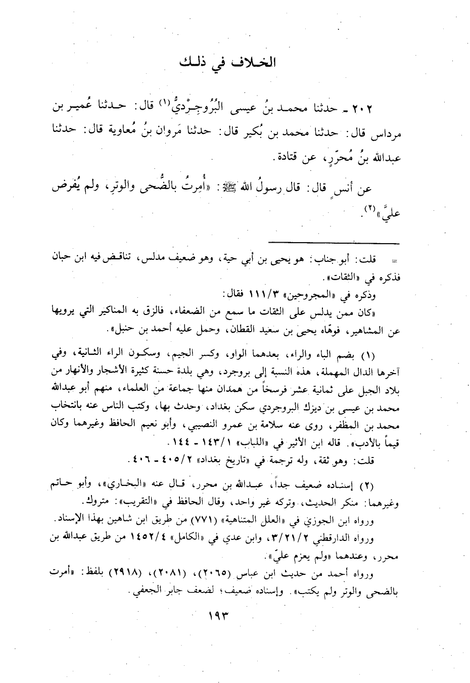 202 - حَدَّثَنَا مُحَمَّدُ بْنُ عِيسَى الْبُرُوجِرْدِيُّ، قَالَ: حَدَّثَنَا عُمَيْرُ بْنُ مِرْدَاسٍ، قَالَ: حَدَّثَنَا مُحَمَّدُ بْنُ بُكَيْرٍ، قَالَ: حَدَّثَنَا مَرْوَانُ بْنُ مُعَاوِيَةَ، قَالَ: حَدَّثَنَا عَبْدُ اللَّهِ بْنُ مُحَرَّرٍ، عَنْ قَتَادَةَ، عَنْ أَنَسٍ، قَالَ: قَالَ رَسُولُ اللَّهِ صَلَّى اللهُ عَلَيْهِ وَسَلَّمَ: «§أُمِرْتُ بِالضُّحَى وَالْوَتْرِ، وَلَمْ يُفْرَضْ عَلَيَّ» -[194]- قَالَ الشَّيْخُ: وَالْحَدِيثُ الْأَوَّلُ أَقْرَبُ إِلَى الصَّوَابِ؛ لَأَنَّ الثَّانِي فِيهِ عَبْدُ اللَّهِ بْنُ مُحَرَّرٍ، وَلَيْسَ عِنْدَهُمْ بِالْمَرْضِيِّ، وَلَا أَعْلَمُ النَّاسِخَ مِنْهُمَا لِصَاحِبِهِ، وَلَكِنِ الَّذِي عِنْدِي أَشْبَهُ أَنْ يَكُونَ حَدِيثَ عَبْدِ اللَّهِ بْنِ مُحَرَّرٍ عَلَى مَا فِيهِ نَاسِخًا لِلْأَوَّلِ؛ لَأَنَّهُ لَيْسَ يُثْبِتُ أَنَّ هَذِهِ الصَّلَوَاتِ فَرْضٌ، وَاللَّهُ أَعْلَمُ