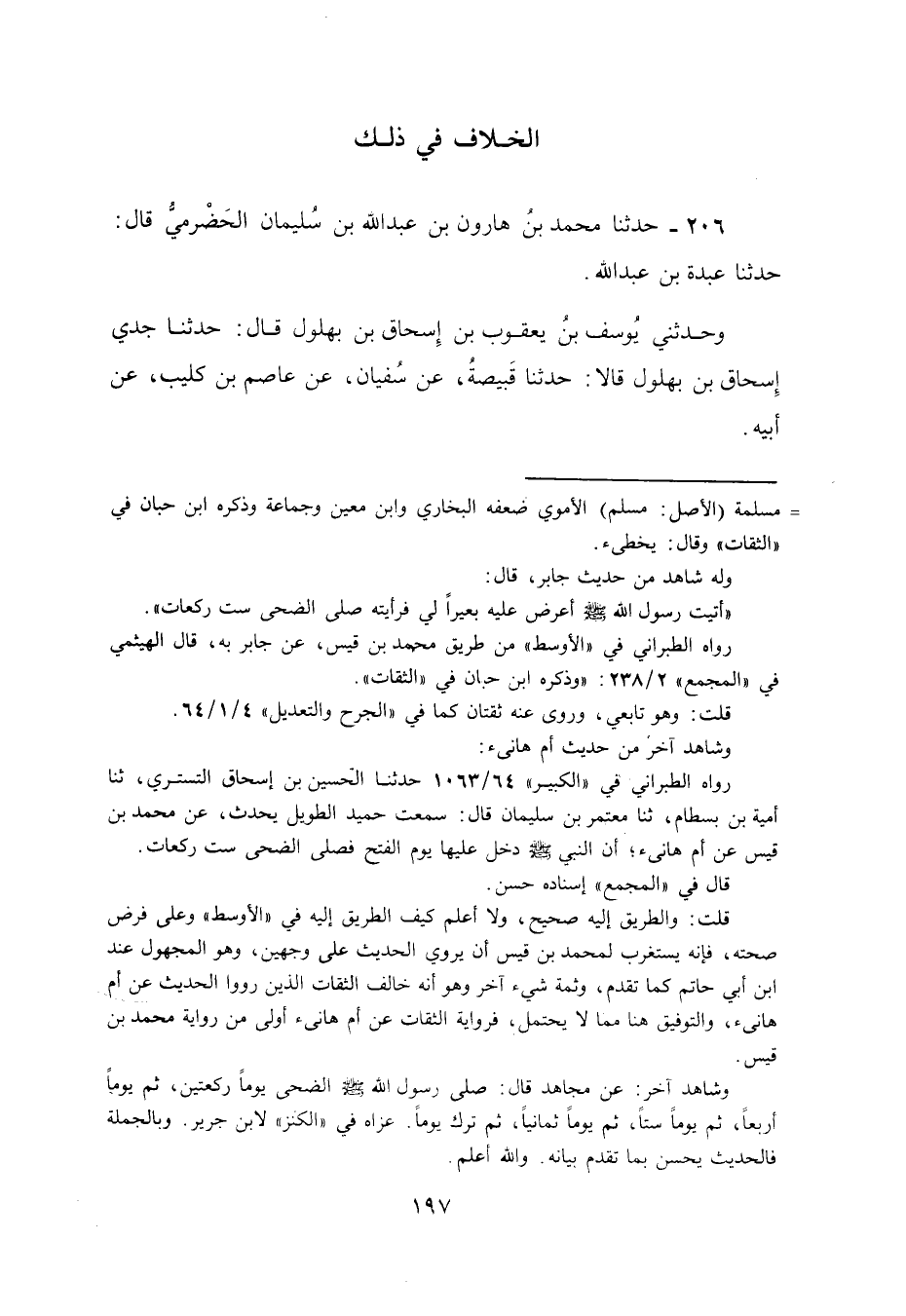 206 - حَدَّثَنَا مُحَمَّدُ بْنُ هَارُونَ بْنِ عَبْدِ اللَّهِ بْنِ سُلَيْمَانَ الْحَضْرَمِيُّ، قَالَ: حَدَّثَنَا عَبْدَةُ بْنُ عَبْدِ اللَّهِ، وَحَدَّثَنِي يُوسُفُ بْنُ يَعْقُوبَ بْنِ إِسْحَاقَ بْنِ بُهْلُولٍ، قَالَ: حَدَّثَنَا جَدِّي إِسْحَاقُ بْنُ بُهْلُولٍ، قَالَا: حَدَّثَنَا قَبِيصَةُ، عَنْ سُفْيَانَ، عَنْ عَاصِمِ بْنِ كُلَيْبٍ، عَنْ أَبِيهِ -[198]-، عَنْ أَبِي هُرَيْرَةَ، قَالَ: §«مَا صَلَّى رَسُولُ اللَّهِ صَلَّى اللهُ عَلَيْهِ وَسَلَّمَ الضُّحَى قَطُّ»
