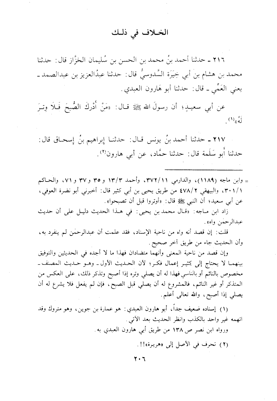 216 - حَدَّثَنَا أَحْمَدُ بْنُ مُحَمَّدِ بْنِ الْحَسَنِ بْنِ سُلَيْمَانَ الْخَزَّازُ، قَالَ: حَدَّثَنَا مُحَمَّدُ بْنُ هِشَامِ بْنِ أَبِي خِيَرَةَ السَّدُوسِيُّ، قَالَ: حَدَّثَنَا عَبْدُ الْعَزِيزِ بْنُ عَبْدِ الصَّمَدِ يَعْنِي الْعَمِّيَّ، قَالَ: حَدَّثَنَا أَبُو هَارُونَ الْعَبْدِيُّ، عَنْ أَبِي سَعِيدٍ،: أَنَّ رَسُولَ اللَّهِ صَلَّى اللهُ عَلَيْهِ وَسَلَّمَ قَالَ: §«مَنْ أَدْرَكَ الصُّبْحَ فَلَا وِتْرَ لَهُ»