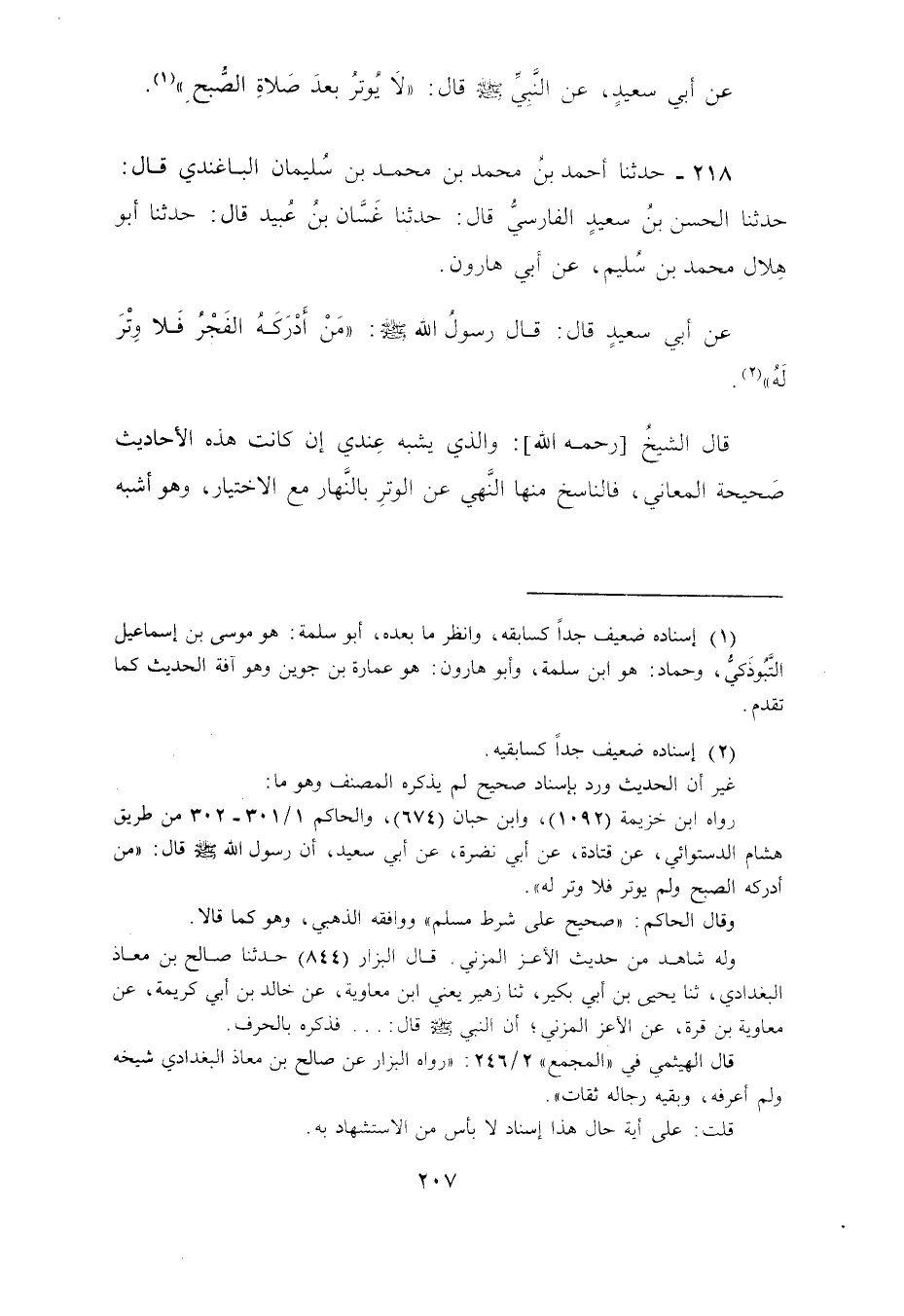 218 - حَدَّثَنَا أَحْمَدُ بْنُ مُحَمَّدِ بْنِ مُحَمَّدِ بْنِ سُلَيْمَانَ الْبَاغَنْدِيُّ، قَالَ: حَدَّثَنَا الْحَسَنُ بْنُ سَعِيدٍ الْفَارِسِيُّ، قَالَ: حَدَّثَنَا غَسَّانُ بْنُ عُبَيْدٍ، قَالَ: حَدَّثَنَا أَبُو هِلَالٍ مُحَمَّدُ بْنُ سُلَيْمٍ، عَنْ أَبِي هَارُونَ، عَنْ أَبِي سَعِيدٍ، قَالَ: قَالَ رَسُولُ اللَّهِ صَلَّى اللهُ عَلَيْهِ وَسَلَّمَ: «§مَنْ أَدْرَكَهُ الْفَجْرُ فَلَا وِتْرَ لَهُ» قَالَ الشَّيْخُ: وَالَّذِي يُشْبِهُ عِنْدِي إِنَّ كَانَتْ هَذِهِ الْأَحَادِيثُ صَحِيحَةَ الْمَعَانِي، فَالنَّاسِخُ مِنْهَا النَّهْي عَنِ الْوَتْرِ بِالنَّهَارِ مَعَ الِاخْتِيَارِ وَهُوَ أَشْبَهُ -[208]- بِذَلِكَ إِلَّا أَنْ يَكُونَ عَلَى وَجْهِ النِّسْيَانِ أَوِ النَّوْمِ عَنْهَا؛ لَأَنَّ النَّبِيَّ صَلَّى اللهُ عَلَيْهِ وَسَلَّمَ قَالَ: «مَنْ نَسِيَ صَلَاةً أَوْ نَامَ فَوَقْتُهَا الْوَقْتُ الَّذِي ذَكَرَ، لَا وَقْتَ لَهَا غَيْرُهُ» وَهَذَا هُوَ فِي الْفَرَائِضِ، فَإِذَا جَازَ فِي الْفَرَائِضِ فَهُوَ فِي النَّوَافِلِ وَالسُّنَنِ أَجُوزُ 0 وَأَمَّا الْحَدِيثُ فِي نَفْسِهِ فِي الرُّخْصَةِ فِي الْقَضَاءِ فَلَيْسَ هُوَ حَدِيثٌ مَرَضِيُّ السَّنَدِ؛ لَأَنَّ حَدِيثَ ابْنِ عُمَرَ رَوَاهُ أَبُو عِصَامٍ، وَهَذَا هُوَ رَوَّادُ بْنُ الْجَرَّاحِ، عَنْ نَهْشَلٍ، وَنَهْشَلٌ هَذَا هُوَ ابْنُ سَعِيدٍ قَرِيبًا مِنْهُ، عَنِ الضَّحَّاكِ، عَنِ ابْنِ عُمَرَ وَلَا أَعْلَمُ أَنَّ الضَّحَّاكَ رَأَى ابْنَ عُمَرَ وَلَا سَمِعَ مِنْهُ وَالثَّانِيَ هُوَ أَقْرَبُ وَإِنْ كَانَ فِيهِ عَبْدُ الرَّحْمَنِ بْنُ زَيْدِ بْنِ أَسْلَمَ