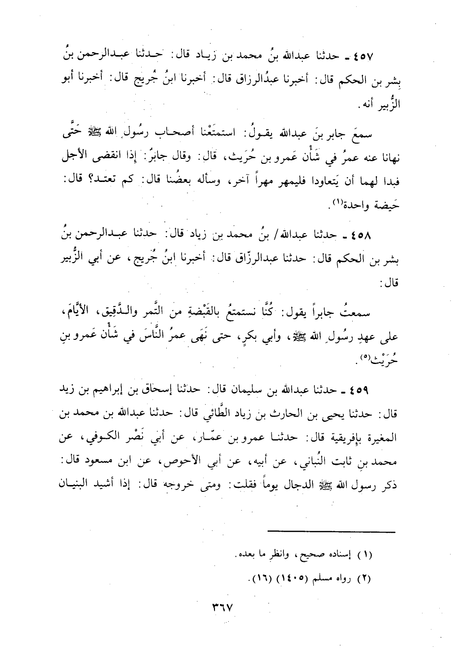457 - حَدَّثَنَا عَبْدُ اللَّهِ بْنُ مُحَمَّدِ بْنِ زِيَادٍ، قَالَ: نا عَبْدُ الرَّحْمَنِ بْنُ بِشْرِ بْنِ الْحَكَمِ، قَالَ: نا عَبْدُ الرَّزَّاقِ، قَالَ أنا ابْنُ جُرَيْجٍ قَالَ: أَخْبَرَنِي أَبُو الزُّبَيْرِ أَنَّهُ سَمِعَ جَابِرَ بْنَ عَبْدِ اللَّهِ يَقُولُ: §" اسْتَمْتَعْنَا أَصْحَابَ رَسُولِ اللَّهِ صَلَّى اللهُ عَلَيْهِ وَسَلَّمَ حَتَّى نَهَانَا عَنْهُ عُمَرُ فِي شَأْنِ عَمْرِو بْنِ حُرَيْثٍ قَالَ: وَقَالَ جَابِرٌ: إِذَا انْقَضَى الْأَجَلُ فَبَدَا لَهُمَا أَنَّ يَتَعَاوَدَا فَيُمْهِرُ مَهْرًا آخَرَ، قَالَ: وَسَأَلَهُ بَعْضُنَا: كَمْ تَعْتَدُّ؟ قَالَ: حَيْضَةً وَاحِدَةً "