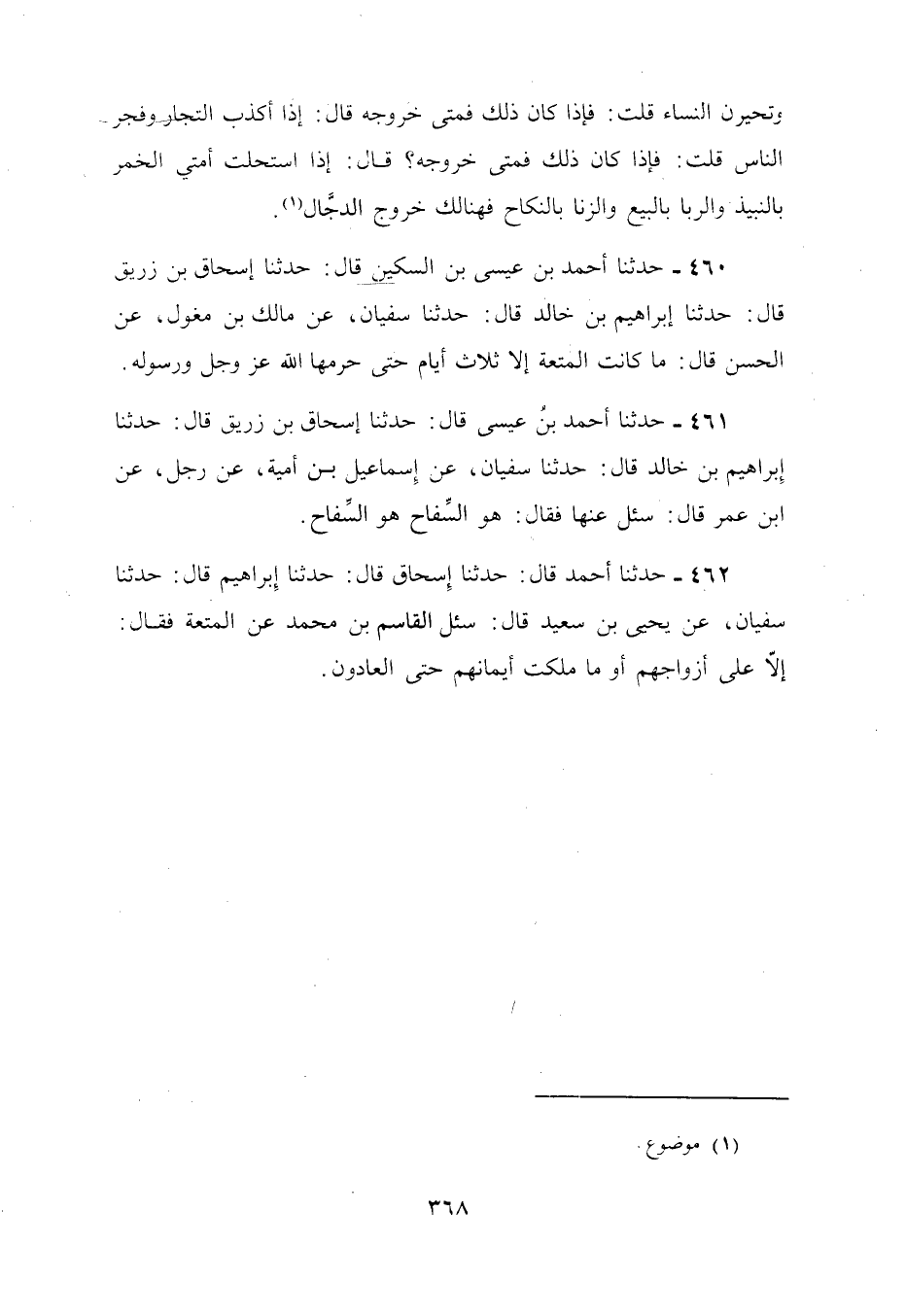 461 - حَدَّثَنَا أَحْمَدُ بْنُ عِيسَى، قَالَ: نا إِسْحَاقُ بْنُ زُرَيْقٍ، قَالَ: نا إِبْرَاهِيمُ بْنُ خَالِدٍ، قَالَ: نا سُفْيَانُ، عَنْ إِسْمَاعِيلَ بْنِ أُمَيَّةَ، عَنْ رَجُلٍ، عَنِ ابْنِ عُمَرَ، قَالَ: سُئِلَ عَنْهَا، فَقَالَ: «§هُوَ السِّفَاحُ، هُوَ السِّفَاحُ»