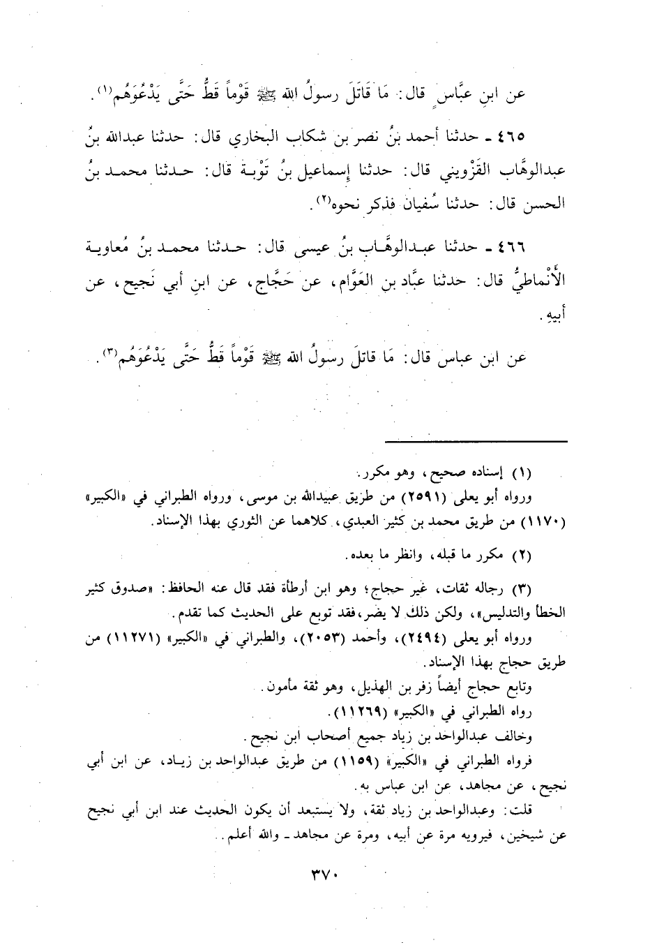 466 - حَدَّثَنَا عَبْدُ الْوَهَّابِ بْنُ عِيسَى، قَالَ: نا مُحَمَّدُ بْنُ مُعَاوِيَةَ الْأَنْمَاطِيُّ، قَالَ: نا عَبَّادُ بْنُ الْعَوَّامِ، عَنْ حَجَّاجٍ، عَنِ ابْنِ أَبِي نَجِيحٍ، عَنْ أَبِيهِ، عَنِ ابْنِ عَبَّاسٍ، قَالَ §«مَا قَاتَلَ رَسُولُ اللَّهِ صَلَّى اللهُ عَلَيْهِ وَسَلَّمَ قَوْمًا قَطُّ حَتَّى يَدْعُوَهُمْ»
