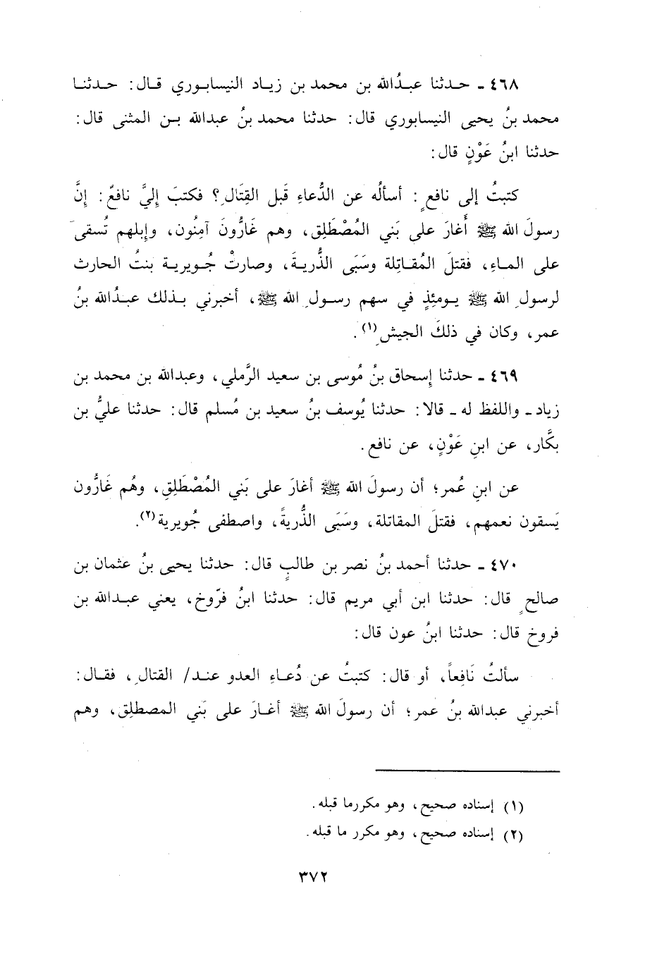 468 - حَدَّثَنَا عَبْدُ اللَّهِ بْنُ مُحَمَّدِ بْنِ زِيَادٍ النَّيْسَابُورِيُّ، قَالَ: نا مُحَمَّدُ بْنُ يَحْيَى، قَالَ: نا مُحَمَّدُ بْنُ عَبْدِ اللَّهِ بْنِ الْمُثَنَّى، قَالَ: نا ابْنُ عَوْنٍ، قَالَ: كَتَبَتُ إِلَى نَافِعٍ أَسْأَلُهُ عَنِ الدُّعَاءِ، قَبْلَ الْقِتَالِ، فَكَتَبَ إِلَيَّ نَافِعٌ أَنَّ رَسُولَ اللَّهِ صَلَّى اللهُ عَلَيْهِ وَسَلَّمَ §" أَغَارَ عَلَى بَنِي الْمُصْطَلِقِ وَهُمْ غَارُّونَ آمِنُونَ وَإِبِلُهُمْ تَسْقِي عَلَى الْمَاءِ، فَقَتَلَ الْمُقَاتِلَةَ وَسَبَى الَذُّرِّيَّةَ، وَصَارَتْ جُوَيْرِيَةُ بِنْتُ الْحَارِثِ لِرَسُولِ اللَّهِ صَلَّى اللهُ عَلَيْهِ وَسَلَّمَ يَوْمَئِذٍ فِي سَهْمِ رَسُولِ اللَّهِ صَلَّى اللهُ عَلَيْهِ وَسَلَّمَ، أَخْبَرَنِي بِذَلِكَ ابْنُ عُمَرَ وَكَانَ فِي ذَلِكَ الْجَيْشِ