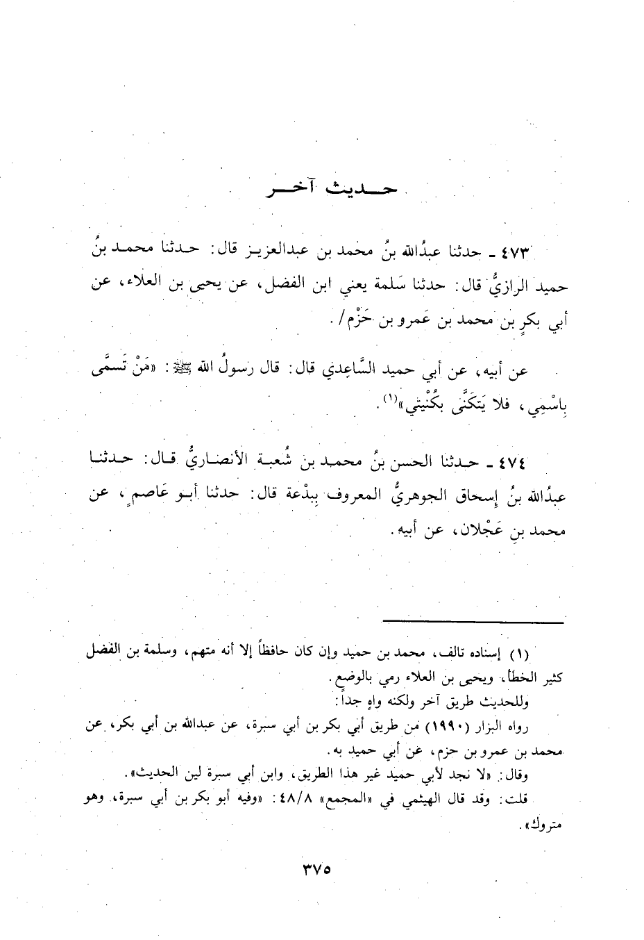 473 - حَدَّثَنَا عَبْدُ اللَّهِ بْنُ مُحَمَّدِ بْنِ عَبْدِ الْعَزِيزِ، قَالَ: نا مُحَمَّدُ بْنُ حُمَيْدٍ الرَّازِيُّ، قَالَ: نا سَلَمَةُ يَعْنِي ابْنَ الْفَضْلِ، عَنْ يَحْيَى بْنِ الْعَلَاءِ، عَنْ عَبْدِ اللَّهِ بْنِ أَبِي بَكْرِ بْنِ مُحَمَّدِ بْنِ عَمْرِو بْنِ حَزْمٍ، عَنْ أَبِيهِ، عَنْ أَبِي حُمَيْدٍ السَّاعِدِيِّ، قَالَ: قَالَ رَسُولُ اللَّهِ صَلَّى اللهُ عَلَيْهِ وَسَلَّمَ: «§مَنْ تَسَمَّى بِاسْمِي، فَلَا يَتَكَنَّى بِكُنْيَتِي»