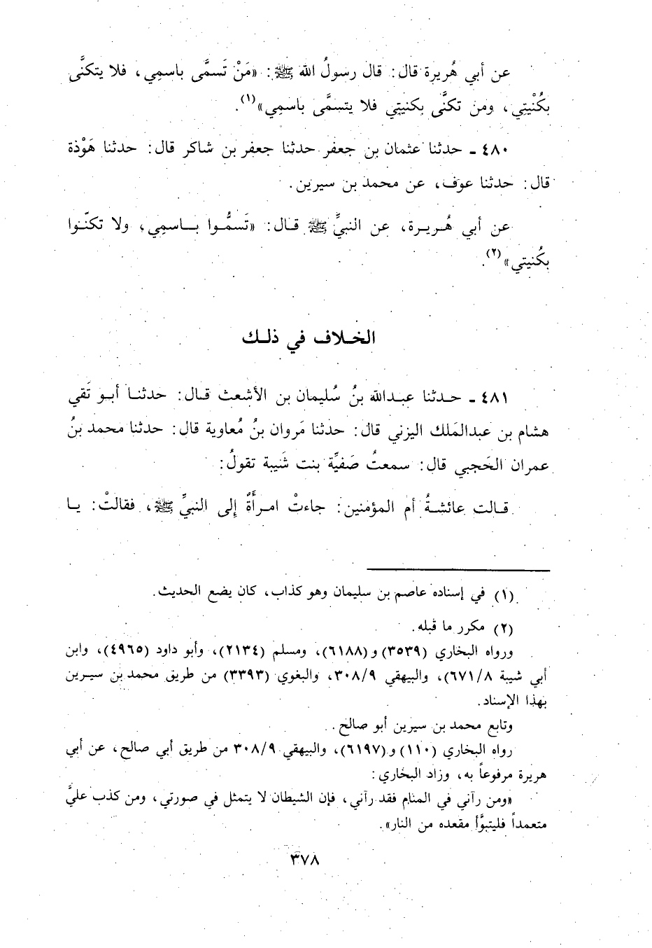 480 - حَدَّثَنَا عُثْمَانُ بْنُ جَعْفَرٍ، نا جَعْفَرُ بْنُ شَاكِرٍ، قَالَ: نا هَوْذَةُ بْنُ خَلِيفَةَ، قَالَ: نا عَوْفٌ، عَنْ مُحَمَّدِ بْنِ سِيرِينَ، عَنْ أَبِي هُرَيْرَةَ، عَنِ النَّبِيِّ صَلَّى اللهُ عَلَيْهِ وَسَلَّمَ قَالَ: §«تَسَمُّوا بِاسْمِي وَلَا تَكَنُّوا بِكُنْيَتِي»