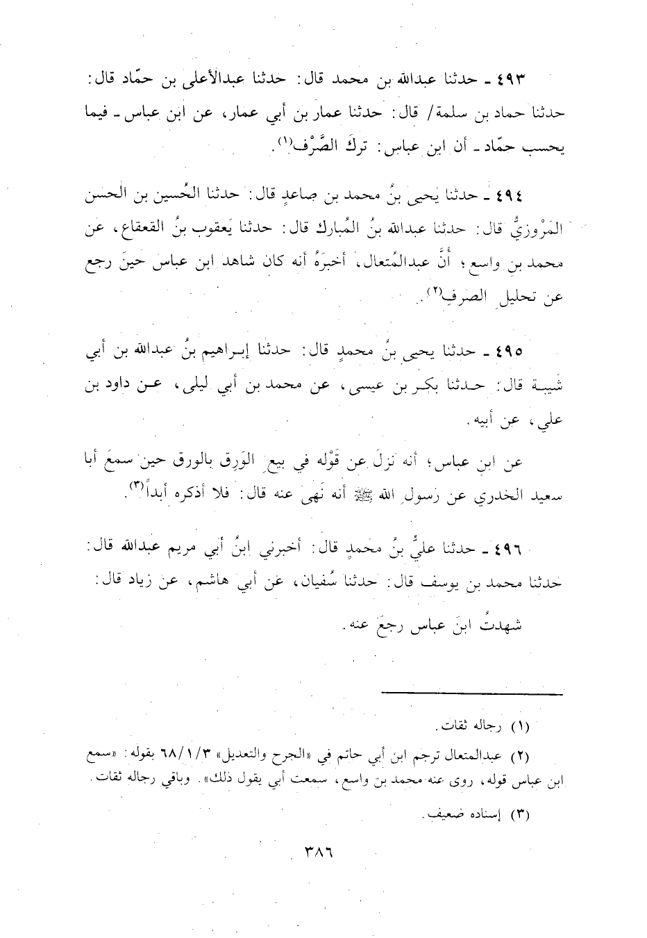 494 - حَدَّثَنَا يَحْيَى بْنُ مُحَمَّدِ بْنِ صَاعِدٍ، قَالَ: نا الْحُسَيْنُ بْنُ الْحَسَنِ الْمَرْوَزِيُّ، قَالَ: نا عَبْدُ اللَّهِ بْنُ الْمُبَارَكِ، قَالَ: نا يَعْقُوبُ بْنُ الْقَعْقَاعِ، عَنْ مُحَمَّدِ بْنِ وَاسِعٍ، أَنَّ عَبْدَ الْمُتَعَالِ، أَخْبَرَهُ أَنَّهُ، كَانَ «شَاهِدَ ابْنِ عَبَّاسٍ حِينَ §» رَجَعَ عَنْ تَحْلِيلِ الصَّرْفِ "