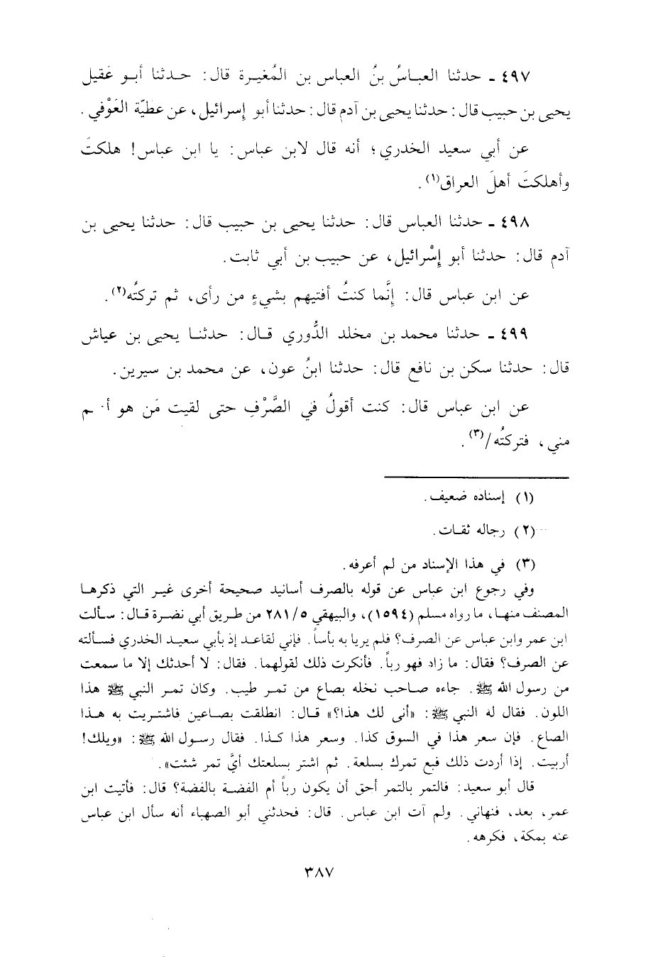 499 - حَدَّثَنَا مُحَمَّدُ بْنُ مَخْلَدٍ الدُّورِيُّ، قَالَ: نا يَحْيَى بْنُ عَيَّاشٍ، قَالَ: نا سَكَنُ بْنُ نَافِعٍ، قَالَ: نا ابْنُ عَوْنٍ، عَنْ مُحَمَّدِ بْنِ سِيرِينَ، عَنِ ابْنِ عَبَّاسٍ، قَالَ: §«كُنْتُ أَقُولُ فِي الصَّرْفِ حَتَّى لَقِيتُ مَنْ هُوَ أَعْلَمُ مِنِّي فَتَرَكْتُهُ»