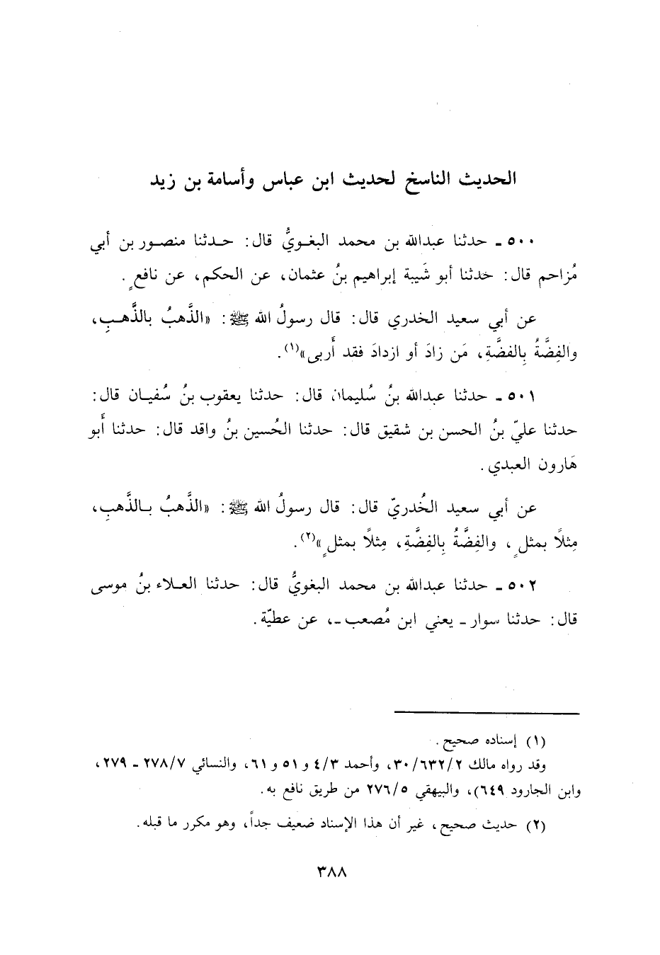 502 - حَدَّثَنَا عَبْدُ اللَّهِ بْنُ مُحَمَّدٍ الْبَغَوِيُّ، قَالَ: نا الْعَلَاءُ بْنُ مُوسَى، قَالَ: نا سَوَّارٌ يَعْنِي: ابْنُ مُصْعَبٍ، عَنْ عَطِيَّةَ -[389]-، عَنْ أَبِي سَعِيدٍ الْخُدْرِيِّ، قَالَ: قَالَ رَسُولُ اللَّهِ صَلَّى اللهُ عَلَيْهِ وَسَلَّمَ: «§الذَّهَبُ بِالذَّهَبِ، وَالْفِضَّةُ بِالْفِضَّةِ، وَالرَّصَاصُ بِالرَّصَاصِ» حَتَّى قَالَ: " وَالنُّحَاسُ بِالنُّحَاسِ، وَالْحَدِيدُ بِالْحَدِيدِ، وَالْبُرُّ بِالْبُرِّ، وَالشَّعِيرُ بِالشَّعِيرِ، حَتَّى قَالَ: «وَالْمِلْحُ بِالْمِلْحِ مِثْلًا بِمِثْلٍ مَنْ زَادَ أَوِ اسْتَزَادَ فَقَدْ أَرْبَى»