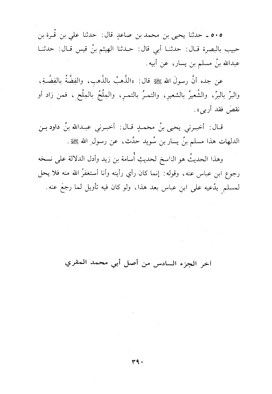 505 - حَدَّثَنَا يَحْيَى بْنُ مُحَمَّدِ بْنِ صَاعِدٍ، قَالَ: نا عَلِيُّ بْنُ قُرَّةَ بْنِ حَبِيبٍ، بِالْبَصْرَةِ قَالَ: نا أَبِي، قَالَ: نا الْهَيْثَمُ بْنُ قَيْسٍ، قَالَ: نا عَبْدُ اللَّهِ بْنُ مُسْلِمِ بْنِ يَسَارٍ، عَنْ أَبِيهِ، عَنْ جَدِّهِ، أَنَّ رَسُولَ اللَّهِ صَلَّى اللهُ عَلَيْهِ وَسَلَّمَ قَالَ: «§الذَّهَبُ بِالذَّهَبِ، وَالْفِضَّةُ بِالْفِضَّةِ، وَالْبُرُّ بِالْبُرِّ، وَالشَّعِيرُ بِالشَّعِيرِ، وَالتَّمْرُ بِالتَّمْرِ، وَالْمِلْحُ بِالْمِلْحِ فَمَنْ زَادَ أَوْ نَقَصَ فَقَدْ أَرْبَى» قَالَ لَنَا يَحْيَى بْنُ مُحَمَّدٍ، قَالَ: لَنَا عَبْدُ اللَّهِ بْنُ دَاوُدَ بْنِ الدَّلْهَاثِ: هَذَا مُسْلِمُ بْنُ يَسَارِ بْنِ سُوَيْدٍ حَدَّثَ عَنْ رَسُولِ اللَّهِ صَلَّى اللهُ عَلَيْهِ وَسَلَّمَ وَهَذَا الْحَدِيثُ هُوَ النَّاسِخُ لِحَدِيثِ أُسَامَةَ بْنِ زَيْدٍ وَأَوَّلُّ الدَّلَالَةِ عَلَى نَسْخِهِ رُجُوعُ ابْنِ عَبَّاسٍ عَنْهُ، وَقَوْلُهُ: إِنَّمَا كَانَ رَأْيًا رَأَيْتُهُ وَأَنَا أَسْتَغْفِرُ اللَّهَ مِنْهُ فَلَا يَحِلُّ لِمُسْلِمٍ أَنْ يَدَّعِيَهُ عَلَى ابْنِ عَبَّاسٍ بَعْدَ هَذَا وَلَوْ كَانَ فِيهِ تَأْوِيلٌ لَمَا رَجَعَ عَنْهُ -[391]-. أَخْبَرَنَا الْقَاضِي الْجَلِيلُ أَبُو بَكْرٍ مُحَمَّدُ بْنُ عُمَرَ بْنِ مُحَمَّدِ بْنِ إِسْمَاعِيلَ بْنِ الْأَخْضَرِ قِرَاءَةً عَلَيْهِ فِي رَجَبٍ سَنَةَ ثَمَانٍ وَعِشْرِينَ وَأَرْبَعِمَائَةٍ، قَالَ: قَرَأْتُ عَلَى الشَّيْخِ أَبِي حَفْصٍ عُمَرَ بْنِ أَحْمَدَ بْنِ عُثْمَانَ بْنِ شَاهِينَ، فَأَقَرَّ بِهِ عَشِيَّةَ الْخمِيسِ الثَّامِنِ مِنْ ذِي الْحِجَّةِ سَنَةَ خَمْسٍ وَسَبْعِينَ وَثَلَاثِمَائِةٍ