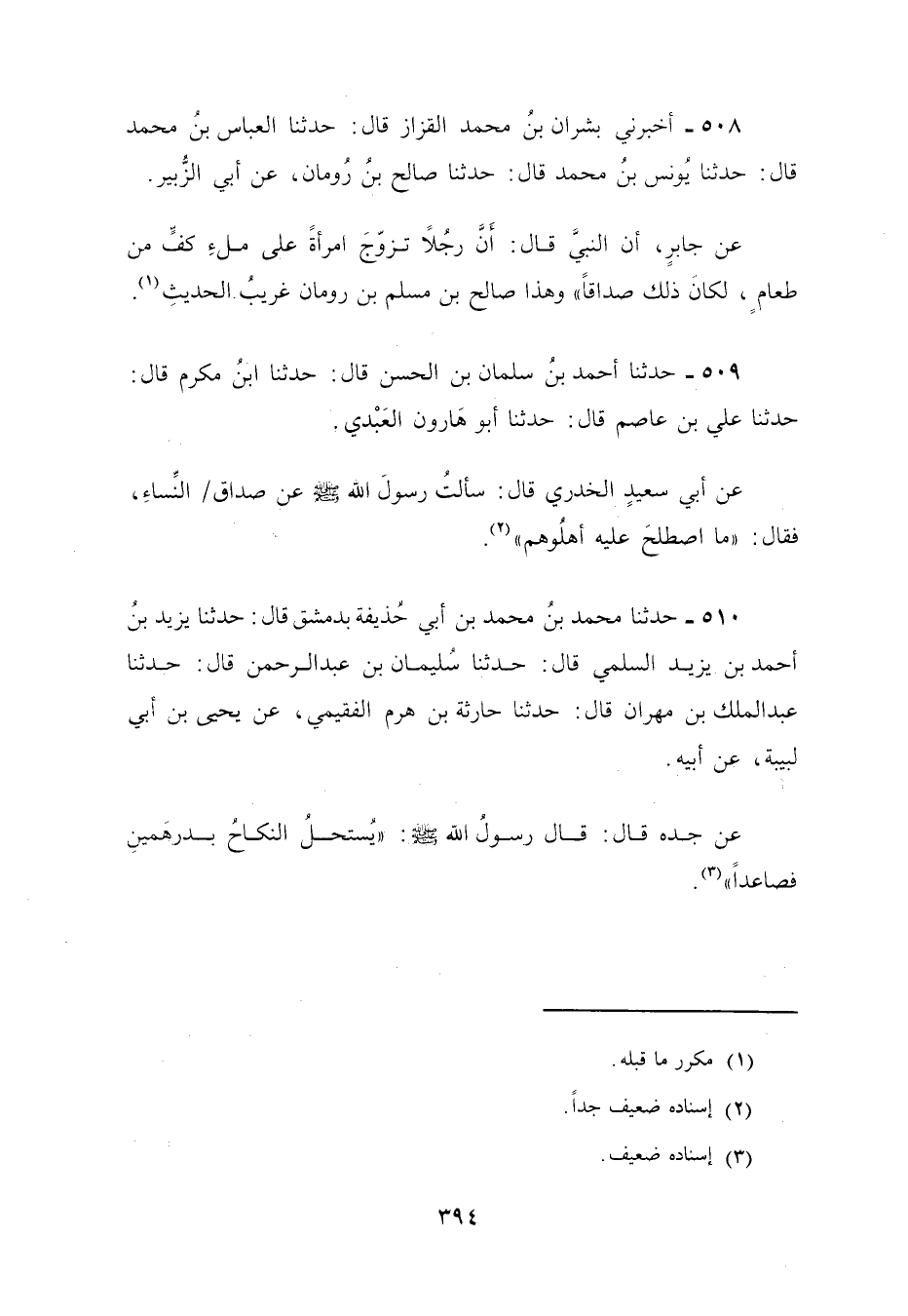 510 - حَدَّثَنَا مُحَمَّدُ بْنُ أَبِي حُذَيْفَةَ، بِدِمَشْقَ قَالَ: حَدَّثَنَا يَزِيدُ بْنُ أَحْمَدَ بْنِ يَزِيدَ السُّلَمِيُّ، قَالَ: حَدَّثَنَا سُلَيْمَانُ بْنُ عَبْدِ الرَّحْمَنِ، قَالَ: حَدَّثَنَا عَبْدُ الْمَلِكِ بْنُ مِهْرَانَ، قَالَ: حَدَّثَنَا حَارِثَةُ بْنُ هَرِمٍ الْفُقَيْمِيُّ، عَنْ يَحْيَى بْنِ أَبِي لَبِيبَةَ، عَنْ أَبِيهِ، عَنْ جَدِّهِ، قَالَ: قَالَ رَسُولُ اللَّهِ صَلَّى اللهُ عَلَيْهِ وَسَلَّمَ: §«يُسْتَحَلُّ النِّكَاحُ بِدِرْهَمَيْنِ فَصَاعِدًا»