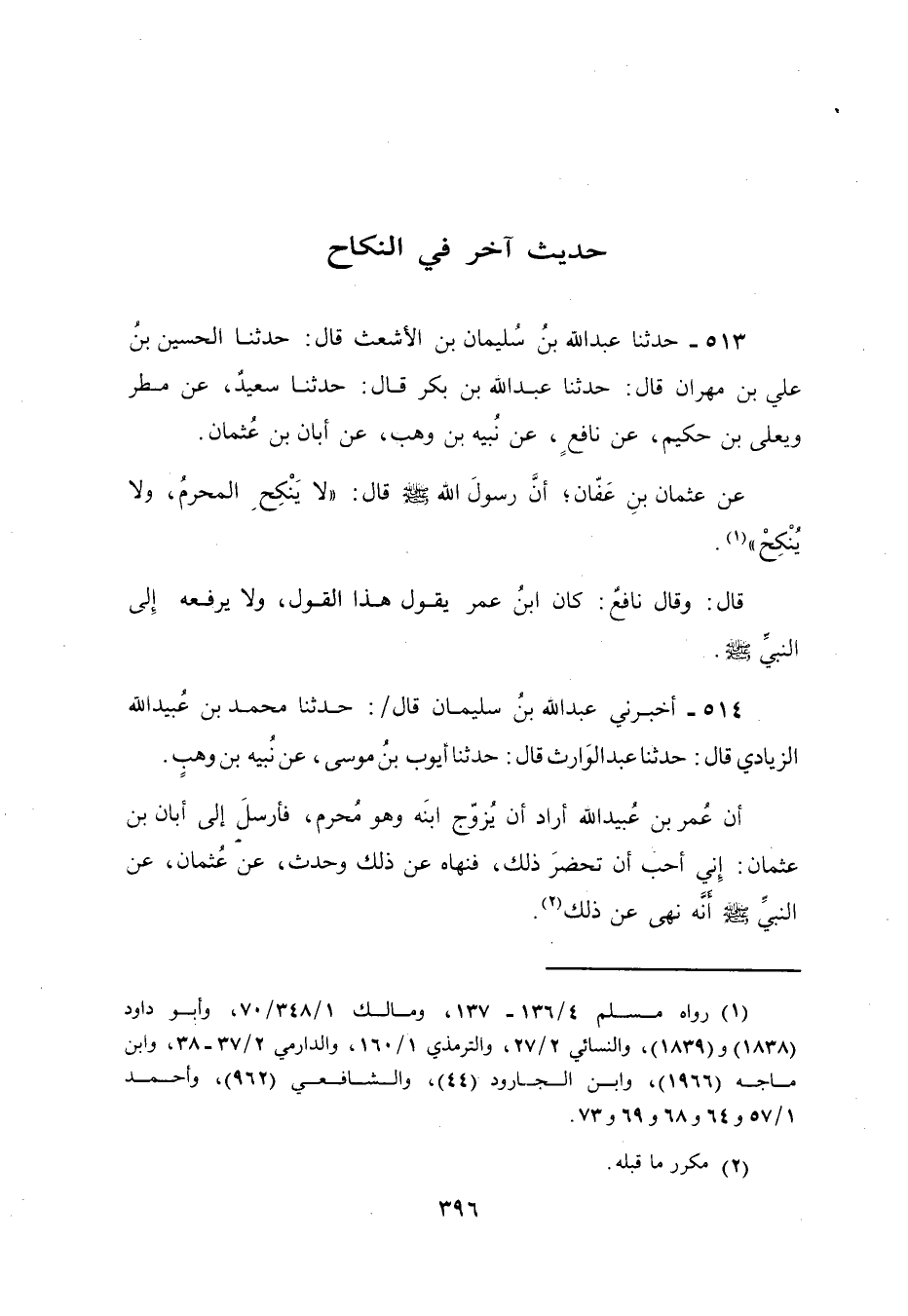 514 - أَخْبَرَنِي عَبْدُ اللَّهِ بْنُ سُلَيْمَانَ، قَالَ: حَدَّثَنَا مُحَمَّدُ بْنُ عُبَيْدِ اللَّهِ الزِّيَادِيُّ، قَالَ: حَدَّثَنَا عَبْدُ الْوَارِثِ، قَالَ: حَدَّثَنَا أَيُّوبُ بْنُ مُوسَى، عَنْ نُبَيْهِ بْنِ وَهْبٍ،: أَنَّ عُمَرَ بْنَ عُبَيْدِ اللَّهِ، أَرَادَ أَنْ يُزَوِّجَ، ابْنَهُ وَهُوَ مُحْرِمٌ، §فَأَرْسَلَ إِلَى أَبَانَ بْنِ عُثْمَانَ: إِنِّي أُحِبُّ أَنْ يَحْضُرَ ذَلِكَ، فَنَهَاهُ عَنْ ذَلِكَ وَحَدَّثَ، عَنْ عُثْمَانَ، عَنِ النَّبِيِّ صَلَّى اللهُ عَلَيْهِ وَسَلَّمَ أَنَّهُ نَهَى عَنْ ذَلِكَ -[397]- وَرَوَى هَذَا الْحَدِيثُ عَنْ نَافِعٍ جَمَاعَةٌ مِنْهُمْ مَالِكُ بْنُ أَنَسٍ، وَابْنُ أَبِي ذِئْبٍ، وَأَيُّوبُ السَّخْتِيَانِيُّ، وَعُبَيْدُ اللَّهِ بْنُ عُمَرَ، وَعُمَرُ بْنُ قَيْسٍ، وَفُلَيْحُ بْنُ سُلَيْمَانَ، وَيَحْيَى بْنُ أَبِي كَثِيرٍ، وَسَعِيدُ بْنُ أَبِي عَرُوبَةَ، وَجَمَاعَةٌ 0 وَرَوَاهُ عَنُ نُبَيْهِ بْنِ وَهْبٍ، أَيُّوبُ بْنُ مُوسَى، وَسَعِيدُ بْنُ أَبِي هِلَالٍ، وَوَلَدَا نُبَيْهٍ