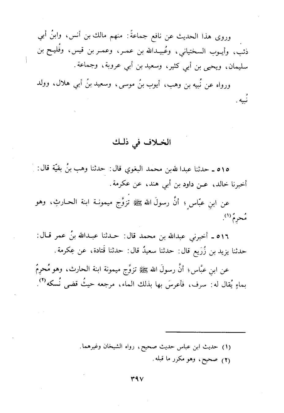 515 - حَدَّثَنَا عَبْدُ اللَّهِ بْنُ مُحَمَّدٍ الْبَغَوِيُّ، قَالَ: حَدَّثَنَا وَهْبُ بْنُ بَقِيَّةَ، قَالَ: أَخْبَرَنَا خَالِدٌ، عَنْ دَاوُدَ بْنِ أَبِي هِنْدٍ، عَنْ عِكْرِمَةَ، عَنِ ابْنِ عَبَّاسٍ، أَنَّ رَسُولَ اللَّهِ صَلَّى اللهُ عَلَيْهِ وَسَلَّمَ §«تَزَوَّجَ مَيْمُونَةَ ابْنَةَ الْحَارِثِ وَهُوَ مُحْرِمٌ»